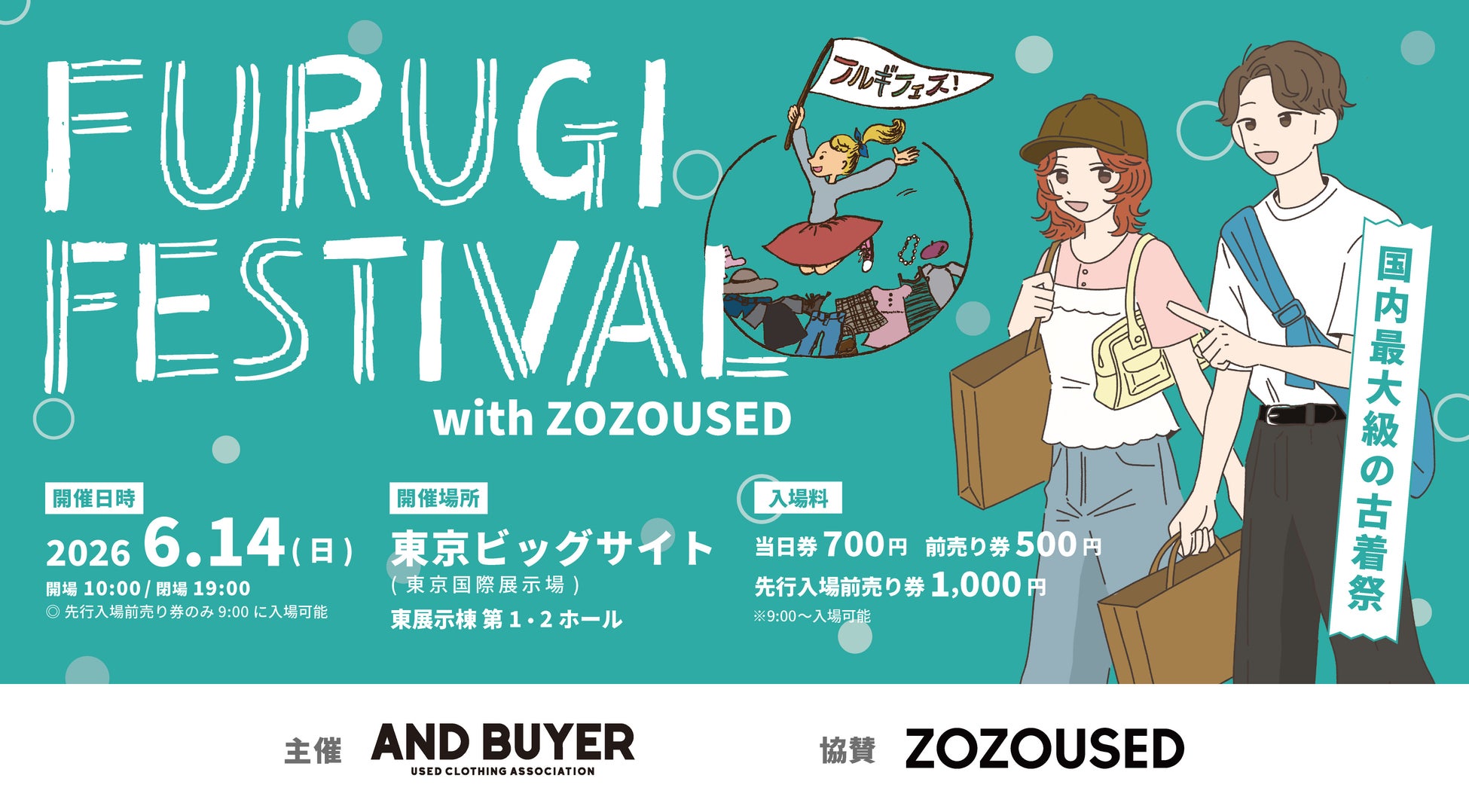 一般社団法人AND BUYER(アンドバイヤー)は、2026年6月14日(日)に東京ビッグサイトで「古着フェス® with ZOZOUSED」を開催します。2017年に始まった「古着フェス®」は、今回で11回目を迎え、今や夏と冬の定番イベントとして定着しています。今回は東京ビッグサイト東1・2ホールの広さ約17000㎡(約5150坪)に全国から300店以上の有名ショップから隠れた名店、オンライン限定ショップまで勢揃い!リーズナブルな価格帯から貴重なヴィンテージアイテムまで、多彩な古着が並ぶこのイベントは、初心者からコアな古着ファンまで、誰もが楽しめる内容です。さらに、ヴィンテージポスターやブランドアクセサリーなど、古着以外のショップも登場し、幅広い魅力を体感いただけます。今回の古着フェス®では、「ZOZOUSED」との連携により、さらに充実した内容でお届けします。