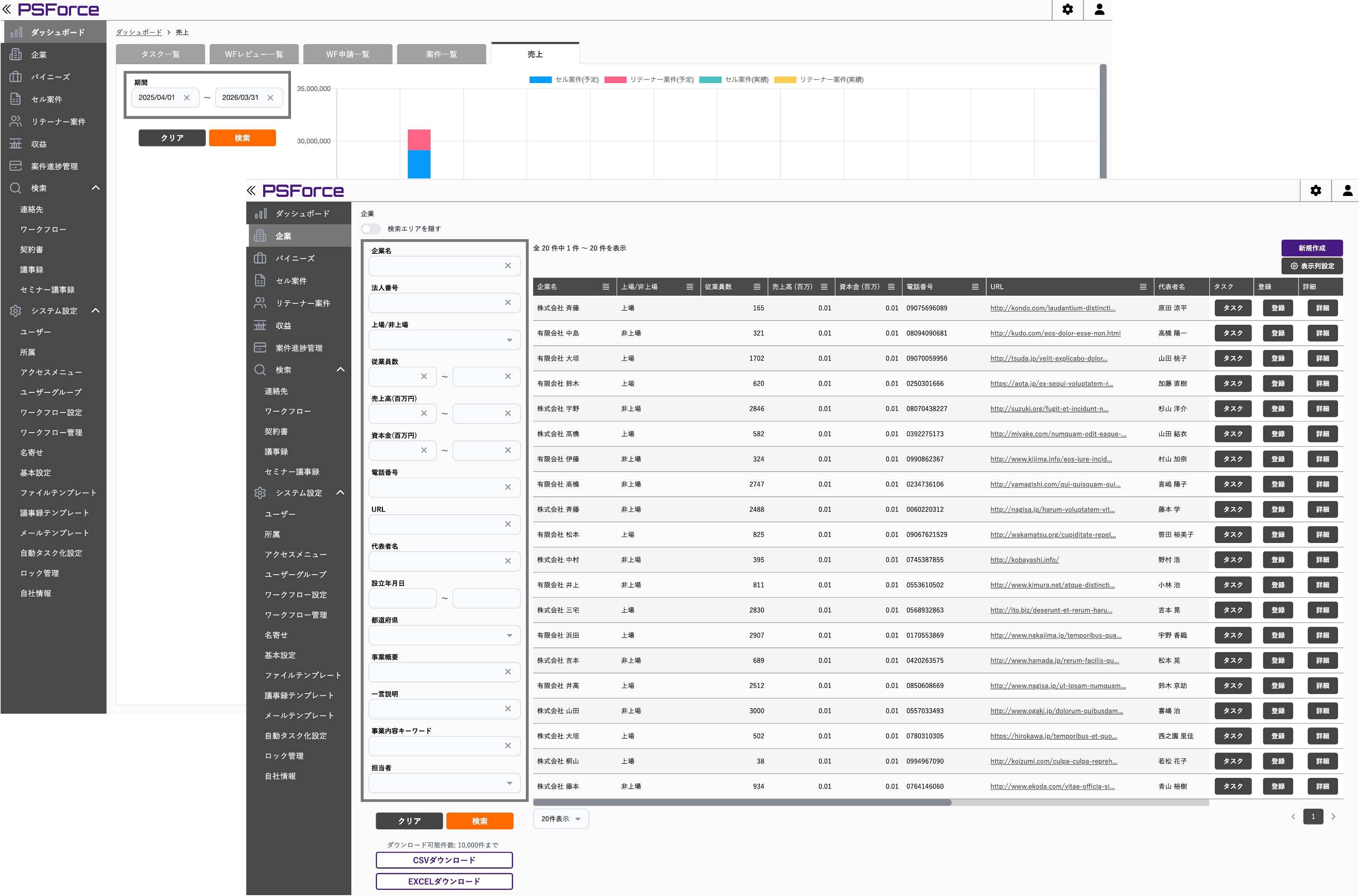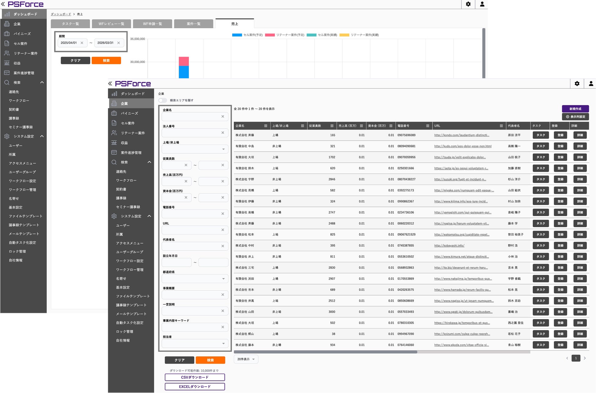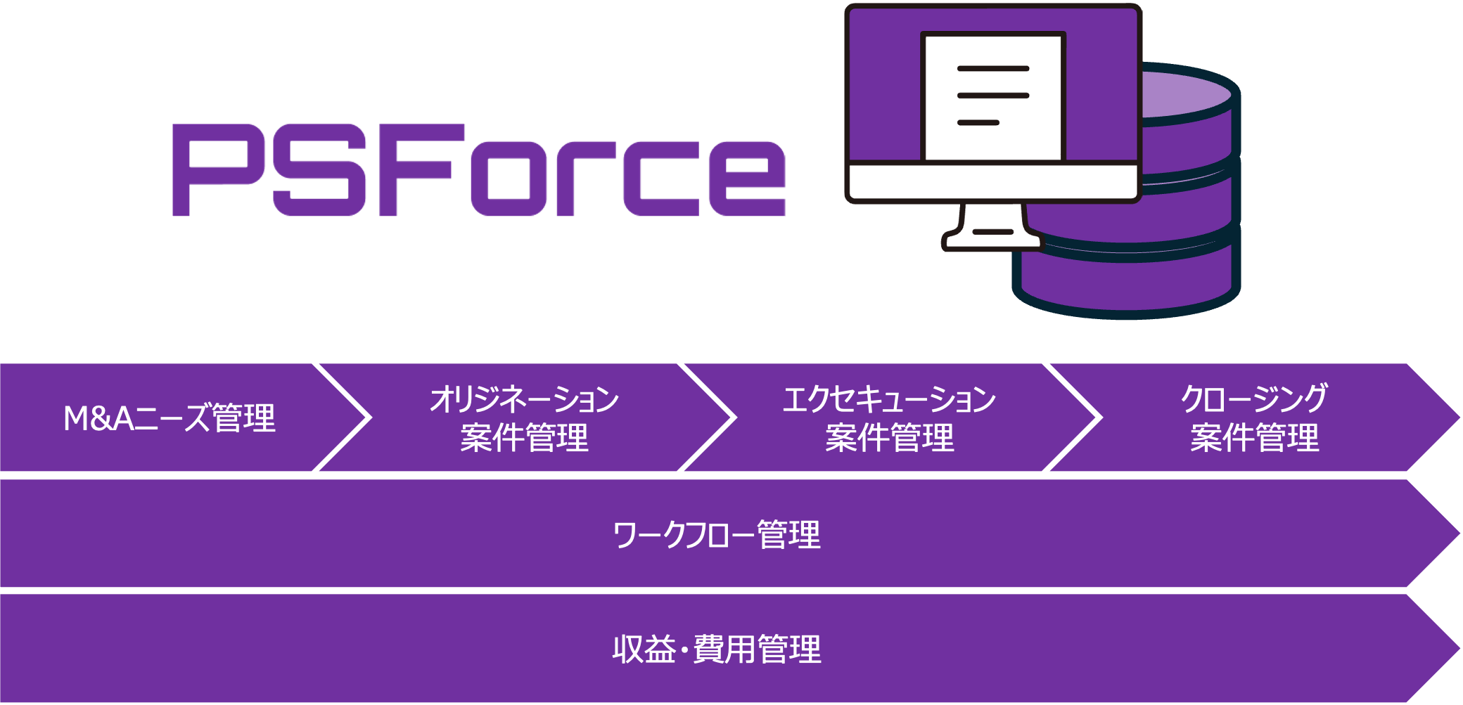 「PSForce」は、当社が10年以上にわたるクライアント支援で培った知見をもとに、M&A業界特有の業務フロー管理を標準化、システム化し、M&Aアドバイザリー業務の管理効率を上げる仕組みを提供するM&A業務管理システムです。