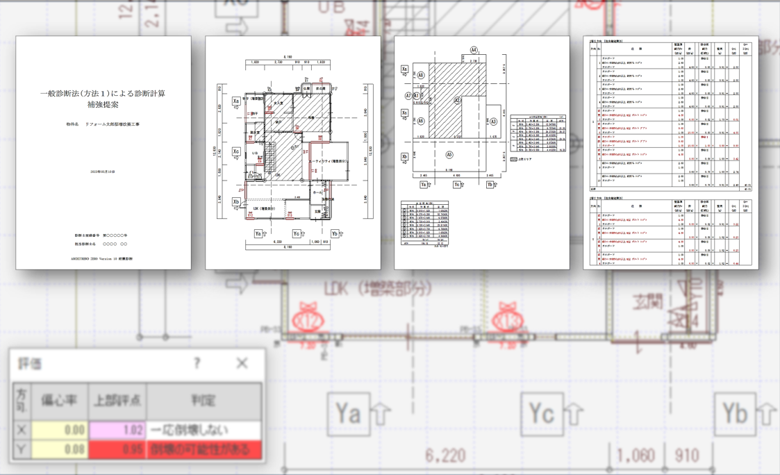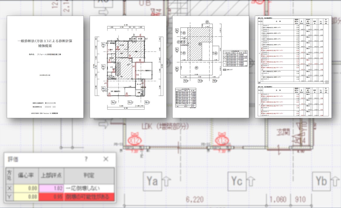 現況図・計画図からシームレスに連動。現況診断~補強計画~補強診断~診断書作成の作業手間を大幅に軽減。