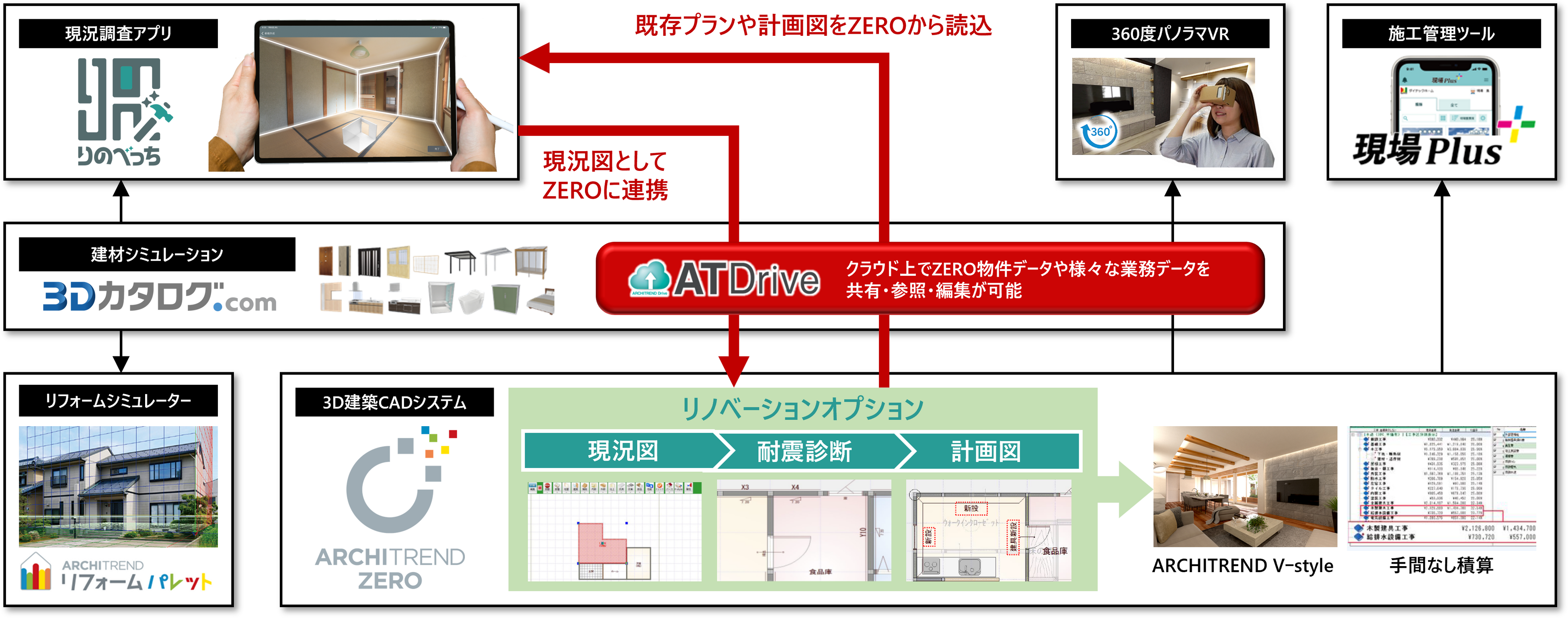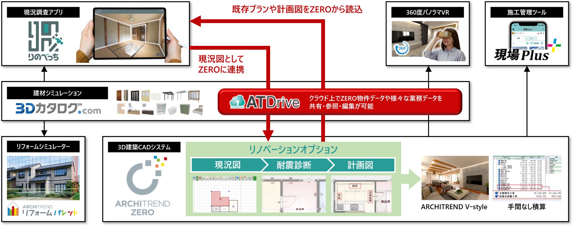 ARCHITREND ZEROの新規オプション 「リノベーション」では、現況図・計画図の作成や耐震診断等の専用機能を搭載。現況調査アプリ 【りのべっち】の図面・写真データなどが連携できるので、現況調査から水廻り・増改築・耐震診断まで大幅な業務効率化を実現します。また、2025年の省エネの適合義務化を見据えて「ARCHITREND 省エネナビ」も大幅に強化。コスト比較シミュレーションや省エネ説明時に有効な提案書の作成など、今後の省エネ業務にもスピーディーに対応できます。さらに「ARCHITREND V-style」ではパースモニタからの直接起動や明るさの自動調整、陰影・凹凸表現の拡張など、ワンランク上のフォトリアルパースをより手軽に作成できるようになりました。