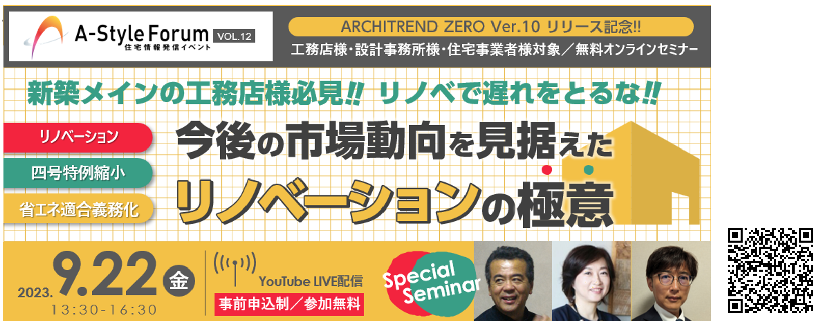 「A‐Styleフォーラム」を開催予定です。リノベーションに関する情報セミナーや新バージョンのご紹介などオンライン開催を予定しておりますのでお気軽にご参加下さい