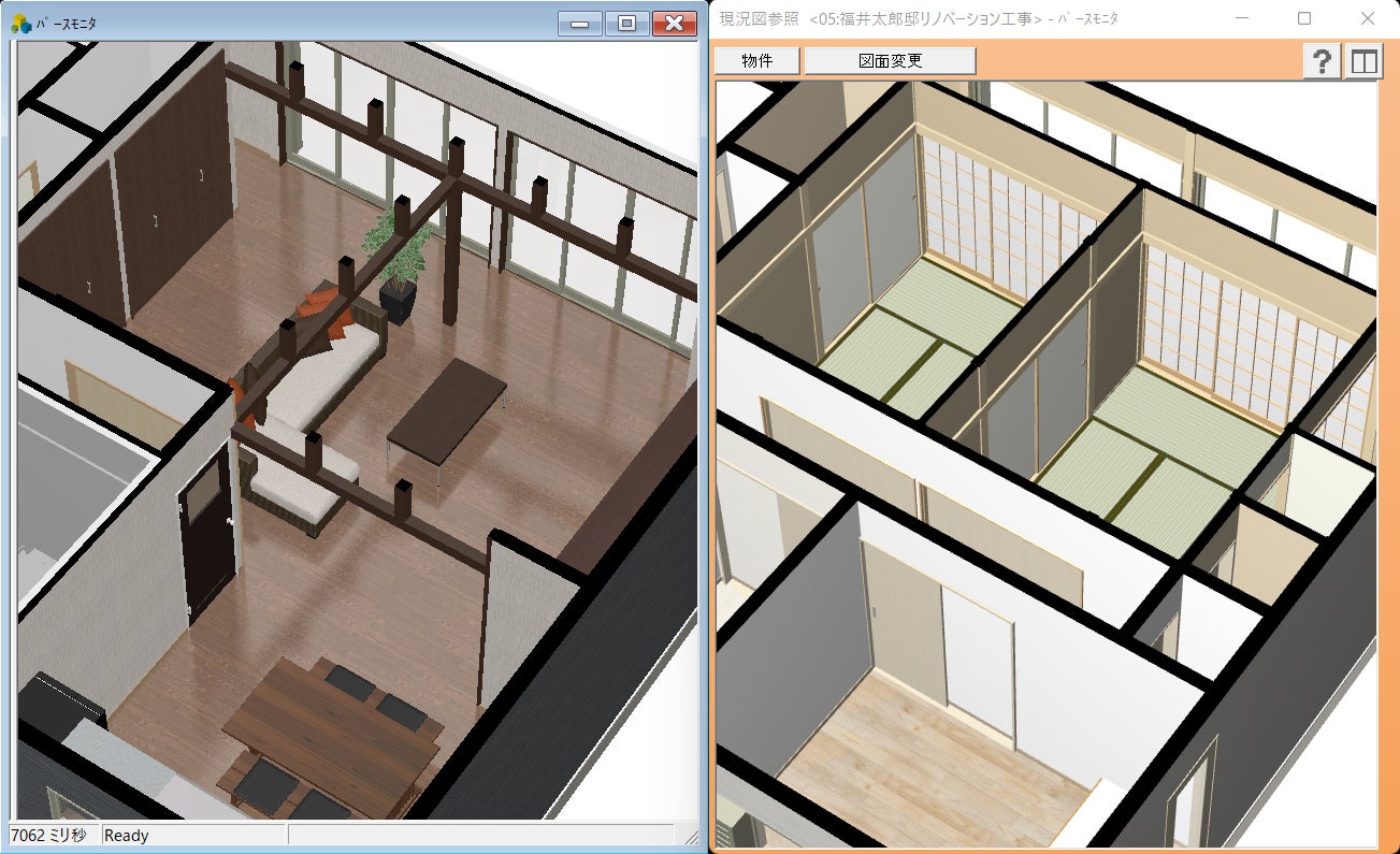・リノベーション前後の図面・パースをワンクリックで比較表示。プランの確認や施主様への提案も分かりやすく。