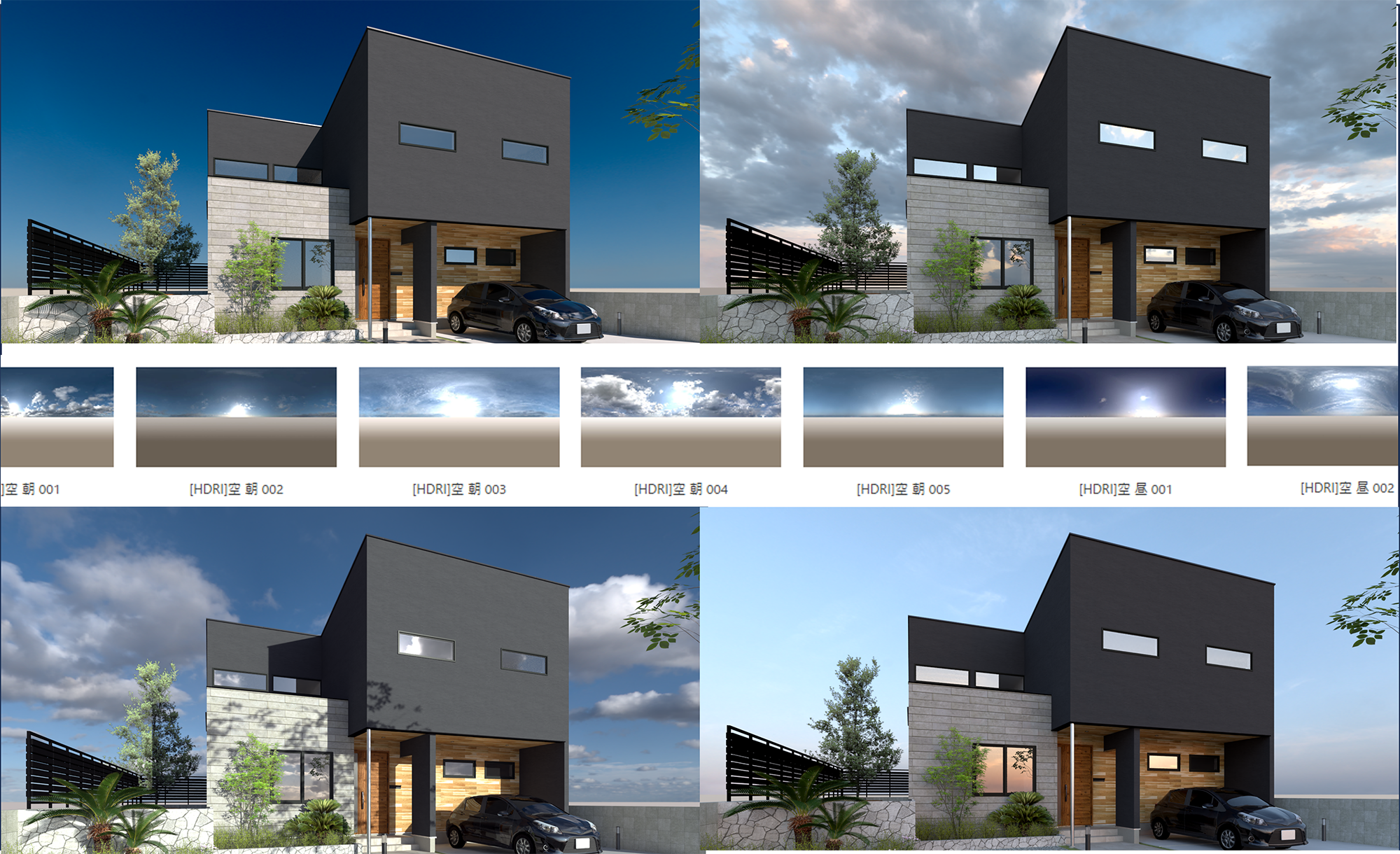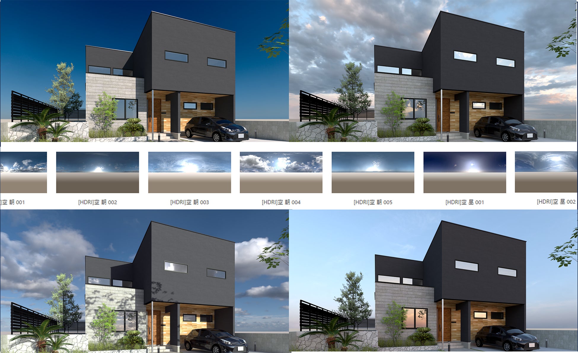 高品質HDRI背景を10種類以上追加!空のみの背景でどんなシーンでも使いやすく、外観イメージをより印象的に。