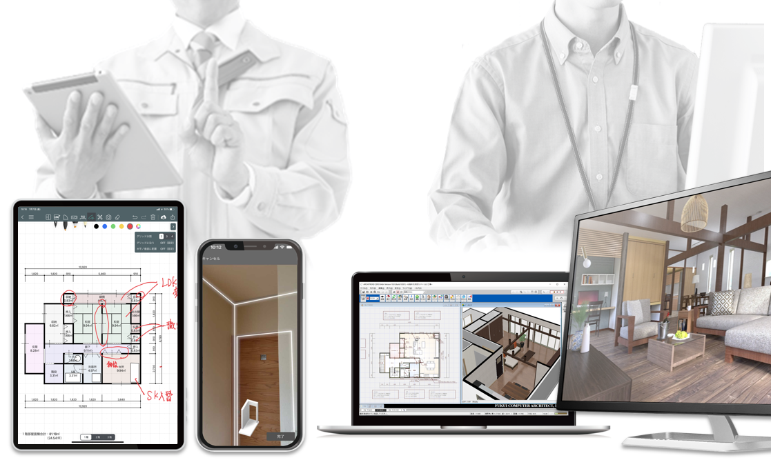 現地調査から現況図・計画図、パースの作成、耐震診断までデータがシームレスに連携してリノベーション業務を ワンストップでアシストできるので、大幅な作業時間の短縮が図れます。