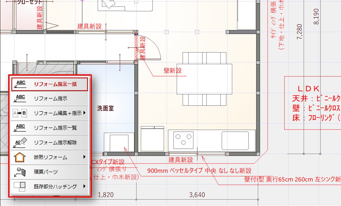 ・作業指示一括自動コマンドで解体・新設などの作業指示を図面に自動登録。指示漏れなどのミスを軽減。