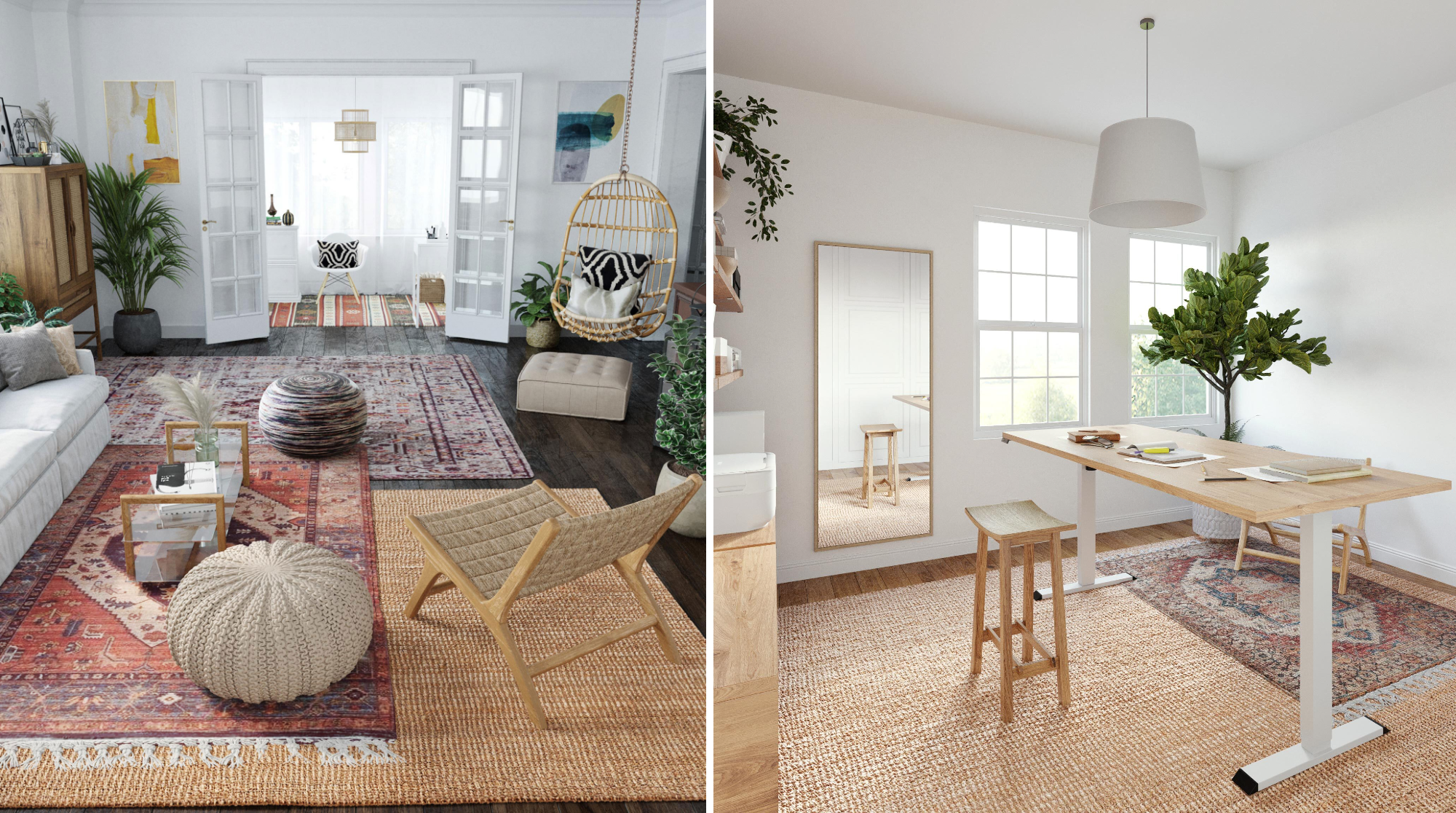 左:ジュートラグを1枚で使用し、自然素材でまとめたコーディネート 右:暖色系のボタニカルデザインのラグを重ねた上品なコーディネート