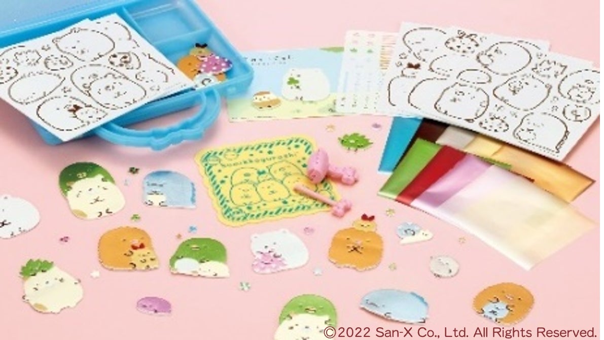 すみっコぐらしのキャラクターシールは、全部で62個作れる。「貼ってはがせるシール台紙」「作業シート」「収納ケース」にもすみっコぐらしのキャラクターがデザインされています。