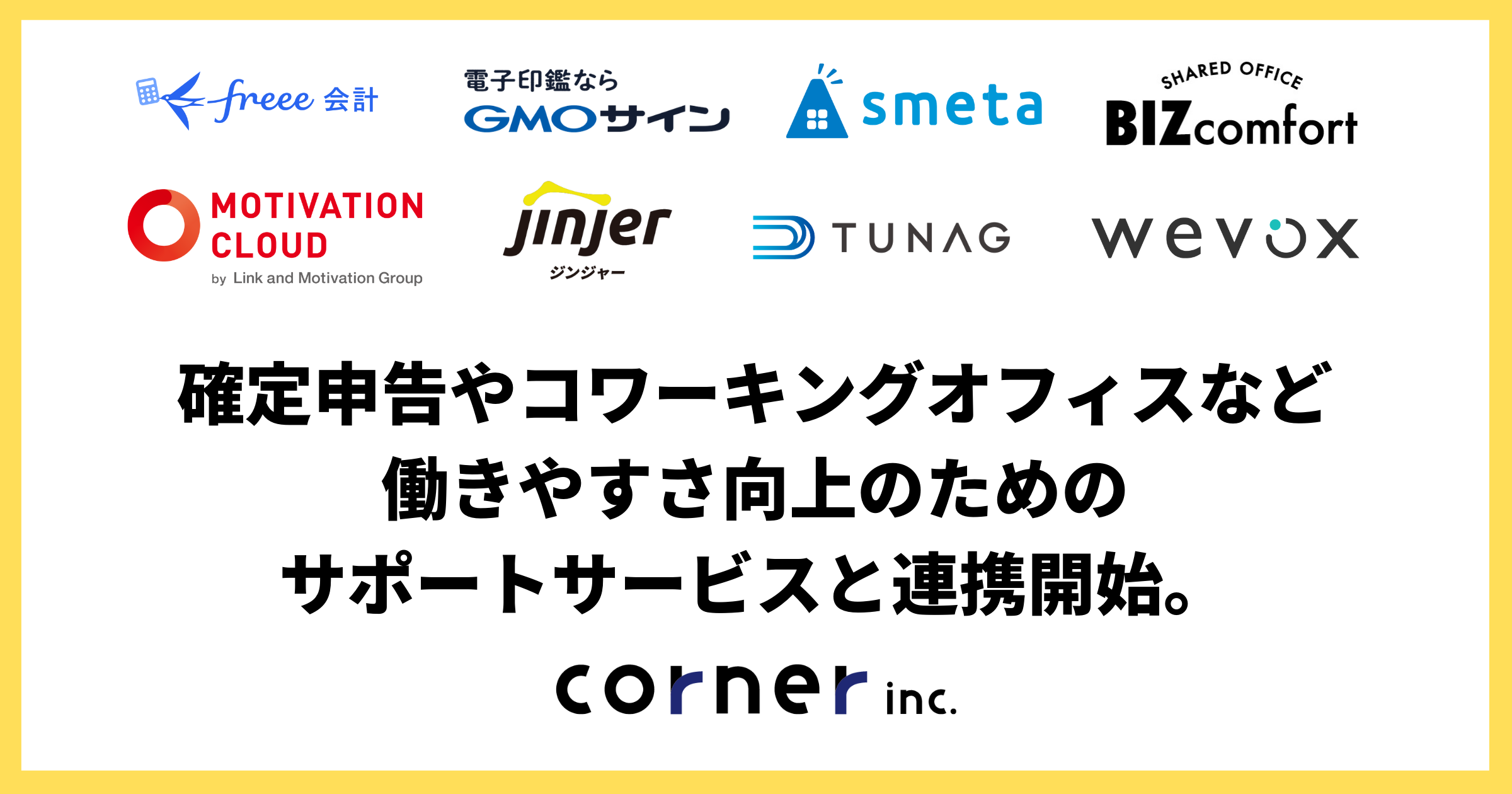 この「corner サポートサービス」により、開業や経理、確定申告、コワーキングスペース、人事システムなどの情報収集の手間を軽減し、スムーズな業務開始を支援いたします。