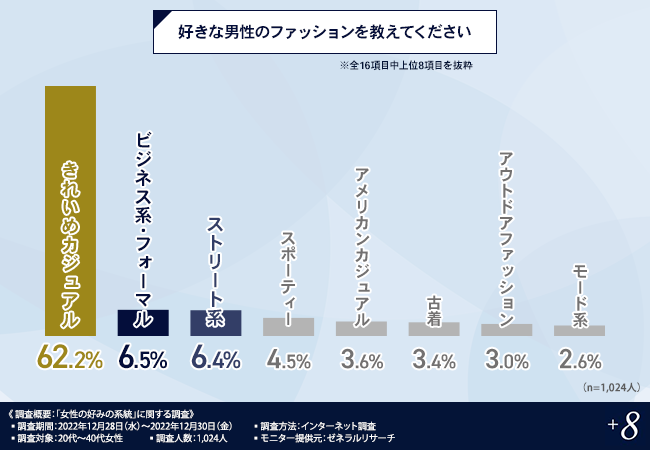 「好きな男性のファッションを教えてください」と質問したところ、『きれいめカジュアル(62.2%)』と回答した方が最も多く、次いで『ビジネス系・フォーマル(6.5%)』『ストリート系(6.4%)』と続きました。