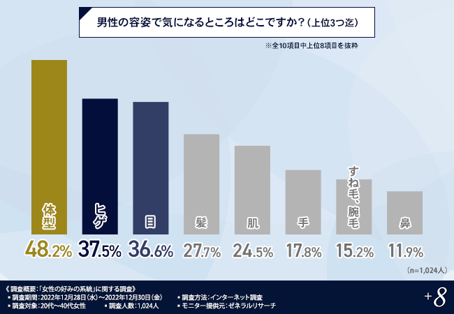 「男性の容姿で気になるところはどこですか?(上位3つ迄)」と質問したところ、『体型(48.2%)』と回答した方が最も多く、次いで『ヒゲ(37.5%)』『目(36.6%)』と続きました。