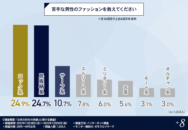 「苦手な男性のファッションを教えてください」と質問したところ、『ロック系(24.9%)』と回答した方が最も多く、次いで『民族柄系(24.7%)』『サーフ系(10.7%)』と続きました。