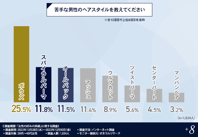 「苦手な男性のヘアスタイルを教えてください」と質問したところ、『ボウズ(25.5%)』と回答した方が最も多く、次いで『スパイラルパーマ(11.8%)』『オールバック(11.5%)』と続きました。