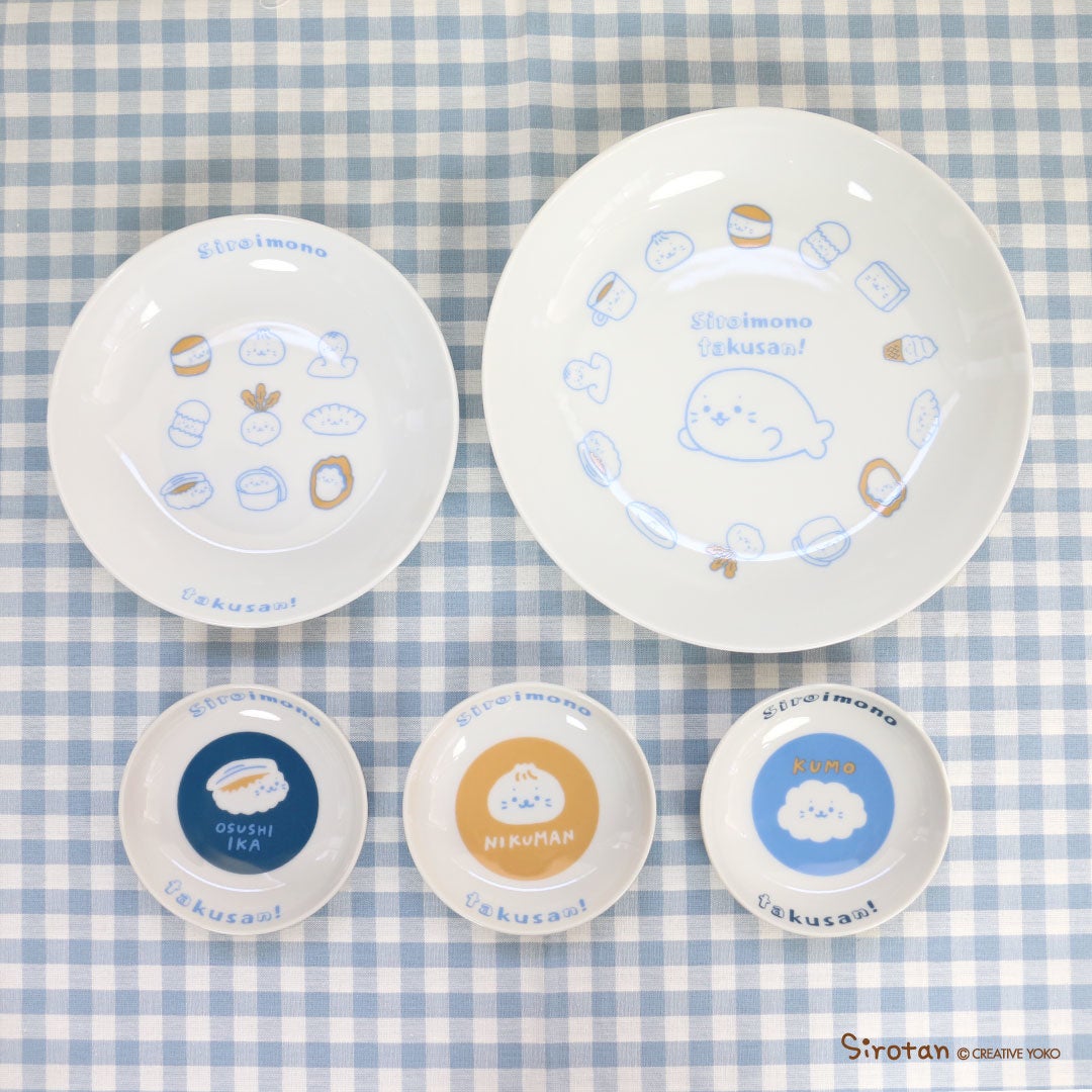 上から ホワイト企業ぬいぐるみ 1,600円 お皿16cm 800円・22cm 1,580円 豆皿 各500円