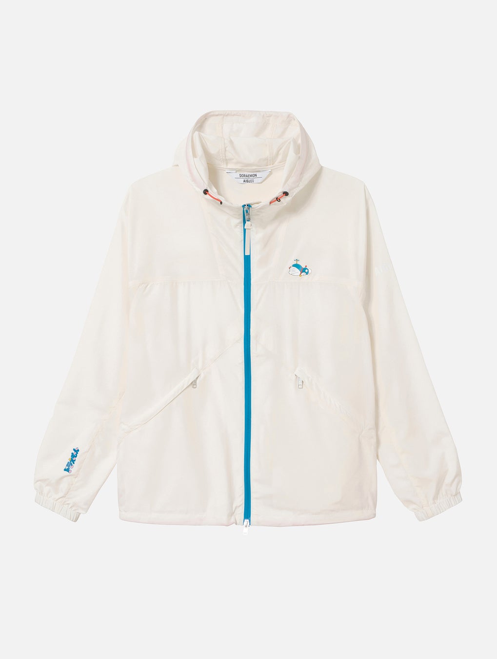 フードの赤い調節紐と青いフロントジッパーで、さりげなくドラえもんのカラーを演出した遊び心あふれるライトジャケット。軽量でコンパクトに折りたためるため、バッグに収納しやすく、いつでもどこへでも持ち運べるアイテムです。