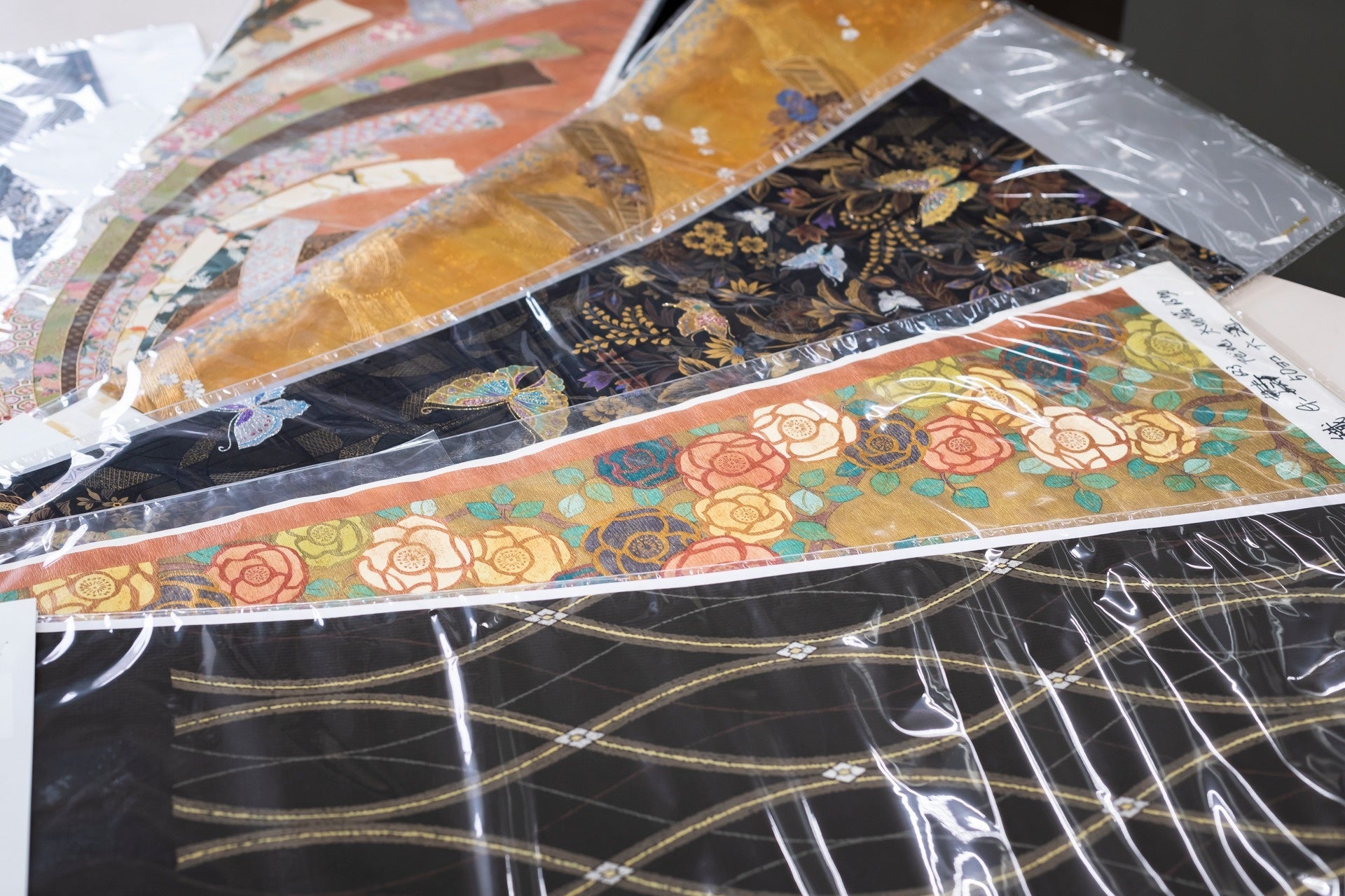 西陣織は、京都の北西部(上京区、北区)の織屋(織物業者)が製造する織物。先染めしてから織っている生地のため、一般的な染色法である後染めよりも丈夫で、シワになりにくいのが特徴です。
