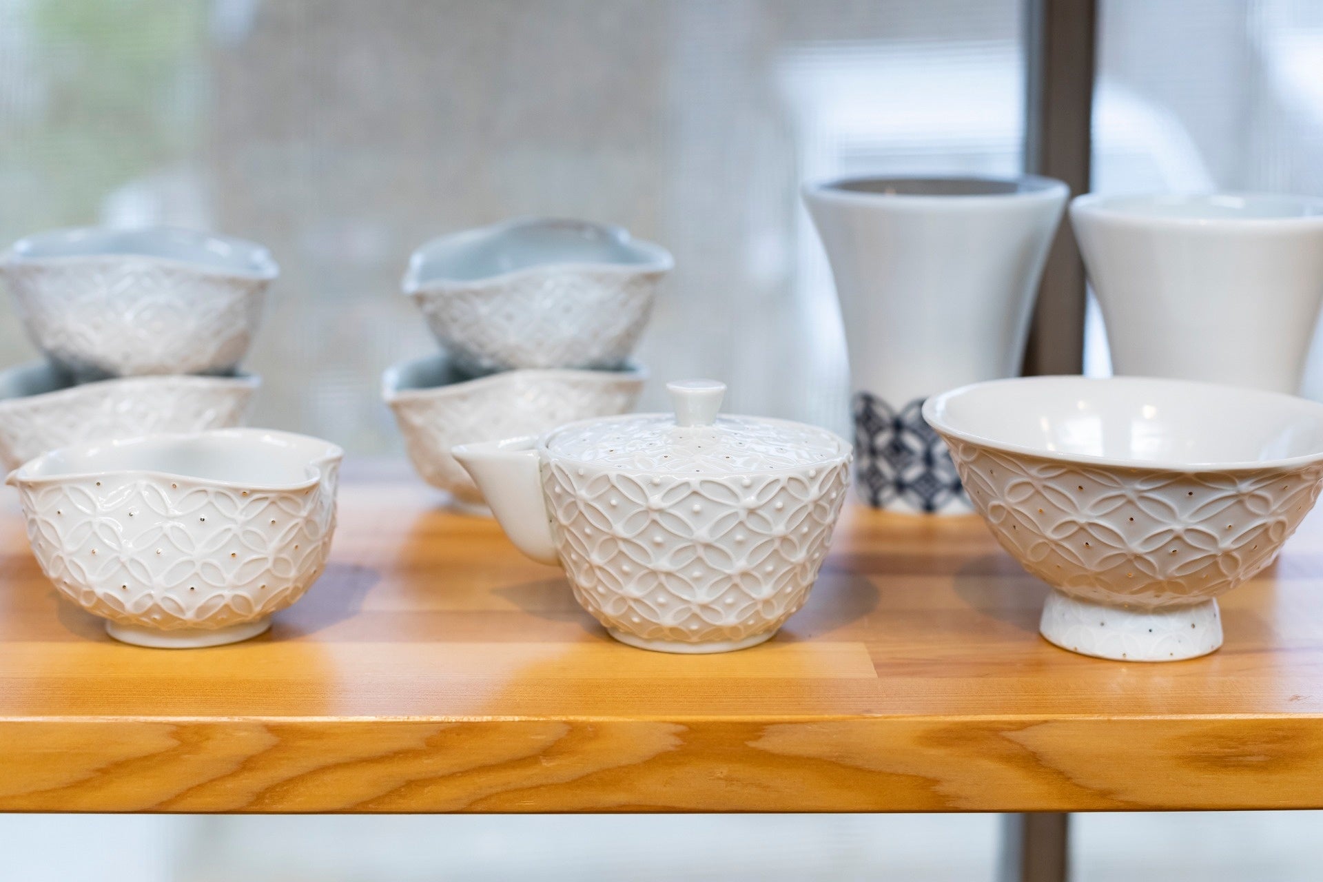 化粧土や釉薬、あるいは絵の具を入れ、素地の上に絞り出して盛るように紋様を描いていく『いっちん』の技法を用いて、見て楽しく、使って楽しい器づくりをしている洸春陶苑。筆による絵付けにはない独特な表現を体験できます。