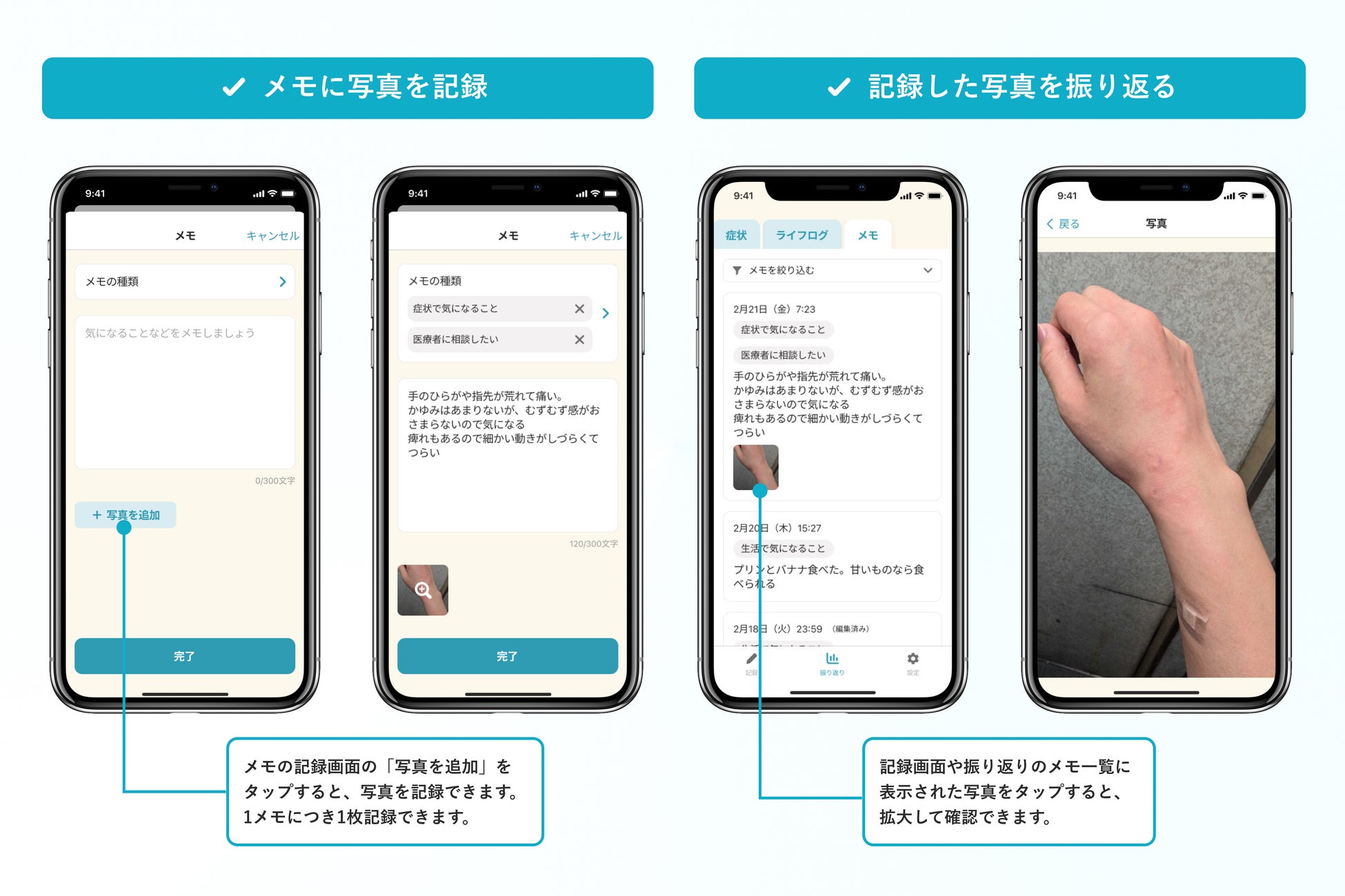 これまで、症状や服薬、自律神経の状態など、患者さん自身の体調を幅広く登録できるほか、メモ機能では「症状で気になること」「日記」「医療者に相談したいこと」など、目的に応じた分類と自由記述で、より細かな記録を残すことができました。このたび、ユーザーの皆様から寄せられた「メモに写真を添付したい」というご要望にお応えし、新たに写真添付機能を追加しました。