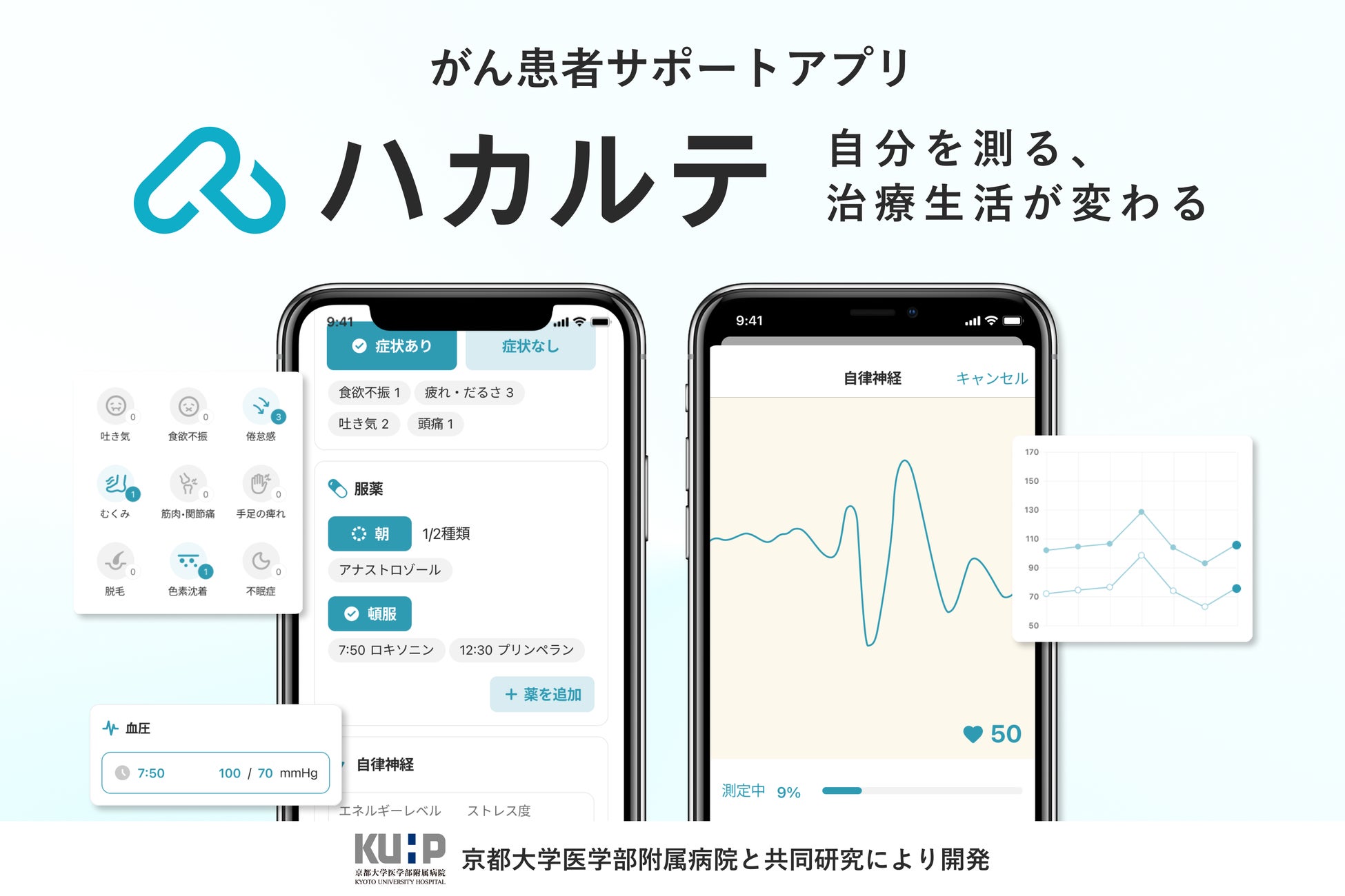 多くのがん患者は、がんと診断されることや治療の副作用などにより、心身ともに大きな負担を感じ、QOLが著しく低下することがわかっています。また、QOLの低下が治療の中断につながることも少なくなく、治療を完遂するためにはQOLの管理が重要となっています。海外では、QOLを管理することにより治療成績が上がったという報告*2もあります。そういった背景もあり、近年はがんを治すことだけではなく、がん患者の不安を取り除き、QOLを維持・向上することの重要性が叫ばれています。しかし、限られた診療時間の中で、医療者が十分に患者のQOLに配慮した対応をすることは難しく、がん治療における課題の一つとなっています。「ハカルテ」は症状やライフログのデータによって心身の状態を可視化することで、がん患者のQOLを客観的に評価し、短い診療時間のなかでも医療者と患者が円滑にコミュニケーションを取れるようサポートします。