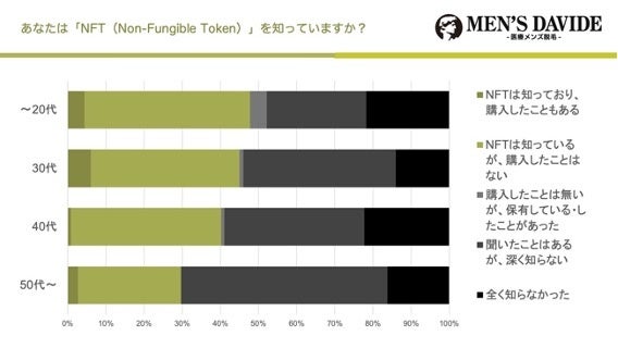 50 代〜:NFT は知っており、購⼊したこともある 1/NFT は知っているが、購⼊したことはない 10/購⼊したことはないが、保有している・したことがあった 0/聴いたことはあるが、深く知らない 20/全く知らなかった 6