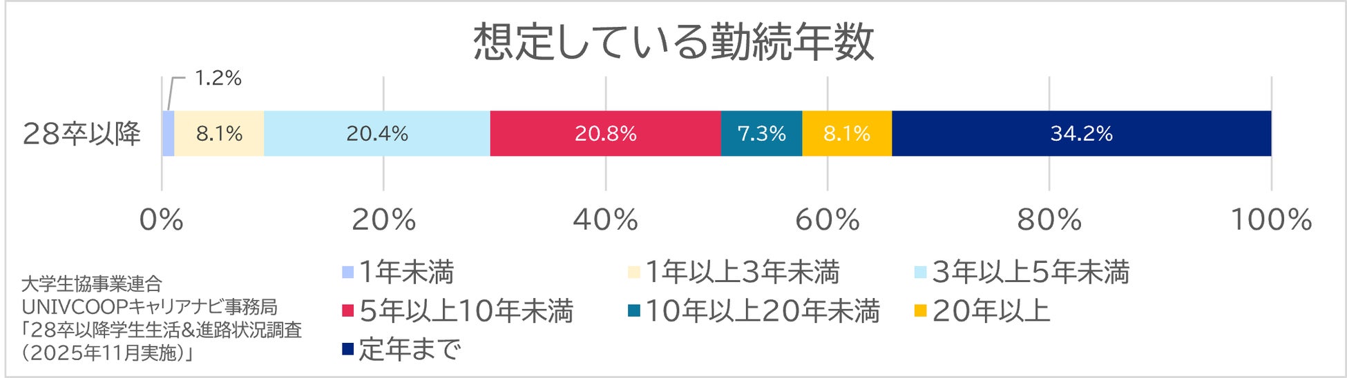 約3人に1人が「定年まで」と回答しており、安定志向が伺える。一方で、若手~中堅層にあたる「3年以上5年未満」、「5年以上10年未満」の回答も多く、キャリアの節目で柔軟に将来を選択したいと考える学生も多い。