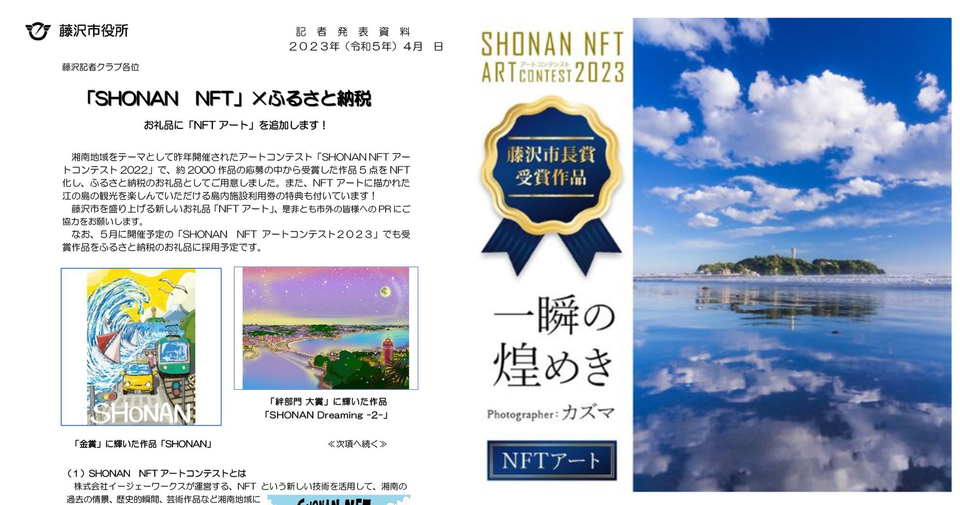2023年5⽉より「SHONAN NFTアートコンテスト2023」を開催し、応募作品の中から藤沢市が選定した作品をNFT化し、ふるさと納税の返礼品として提供しました。