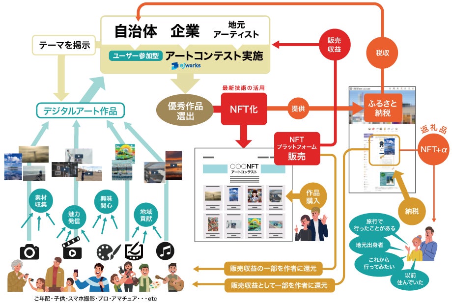 株式会社イージェーワークス(本社:神奈川県横浜市、代表取締役社長:枝松 徹)は、2023年12月25日、地域創生を目的に、NFTを活用したユーザー参加型アートコンテストの実施及びNFT化された作品をふるさと納税返礼品コンテンツとして提供するビジネスモデルの特許を出願。2024年4月より本格的に営業を開始し、代理店などの募集も行う予定。