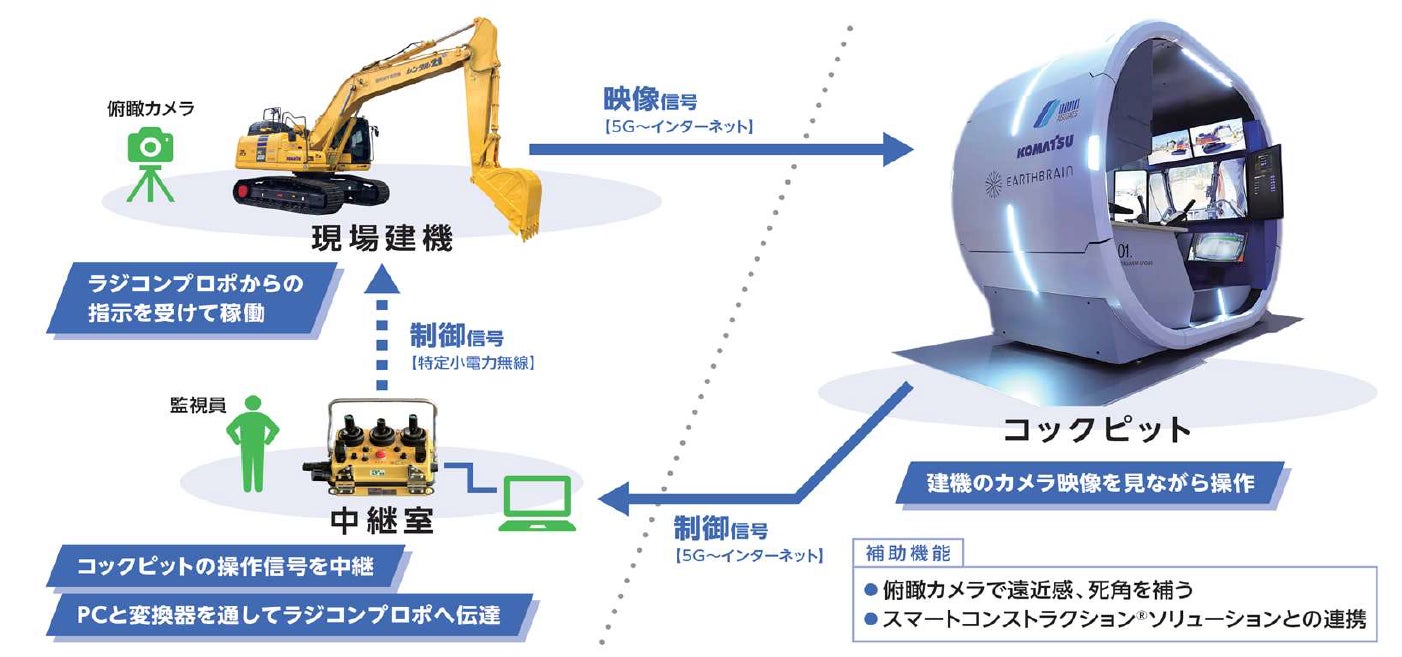 導入した遠隔操作システムはコックピット・中継室・現場建機で構成されています(「概要図」参照)。コックピットからの制御信号は中継室へ送信され、変換器を介してラジコンプロポへ伝達されます。現場建機は、このラジコンプロポからの信号を受信し、稼働する仕組みとなっており、現場で通信環境を確保することにより運用することができます。