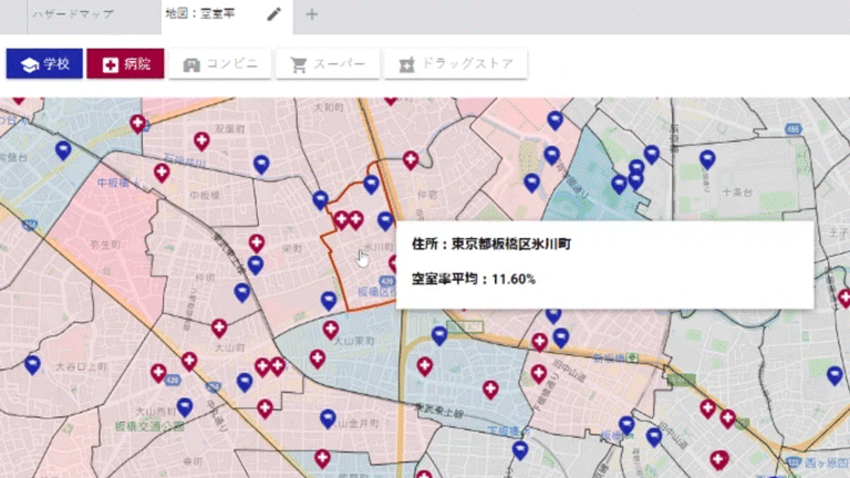 ↑機能イメージ:地図にカーソルを合わせると、その町丁目ごとの空室率が表示される。