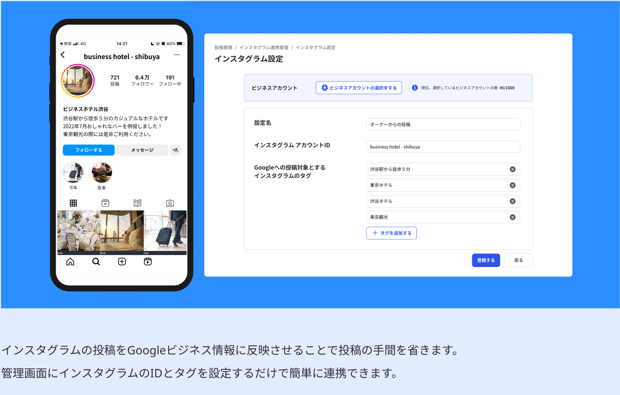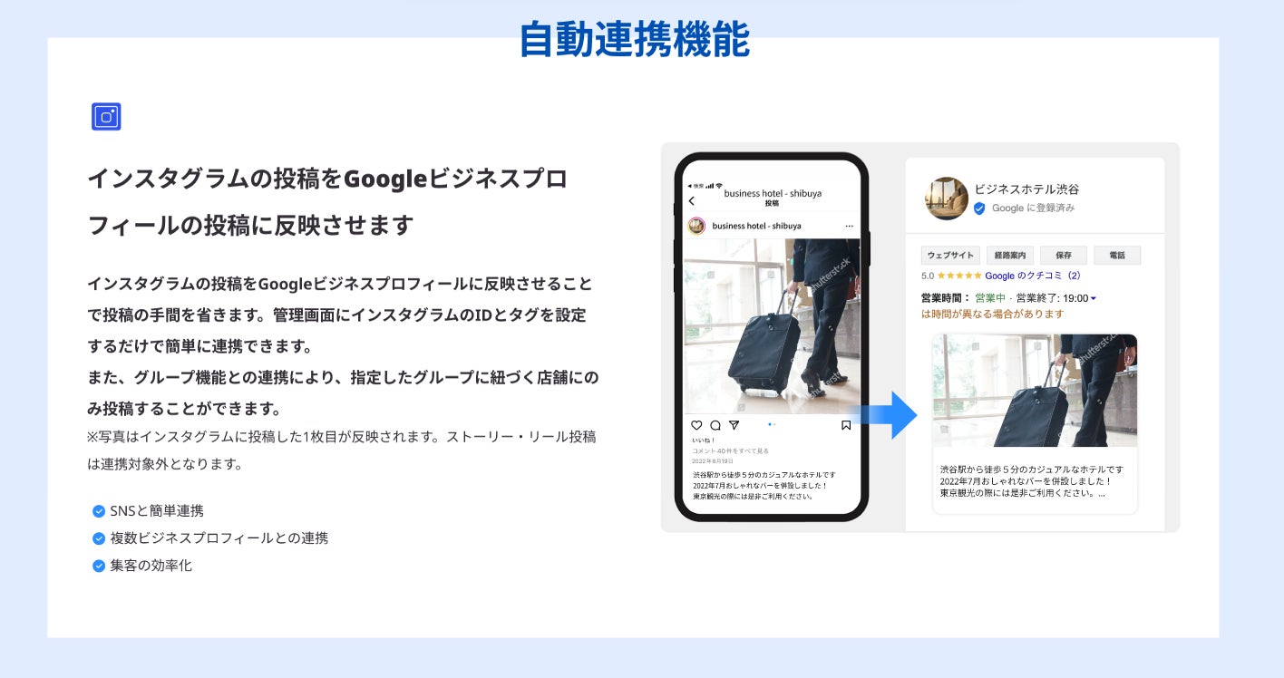 Instagramに通常通り投稿をいただくだけで、システムが自動で投稿内容を抽出しGoogleビジネスプロフィールへと投稿します。二重管理の手間が解消されるとともに、Google側へのPRコンテンツをより効率的に作成できるようになります。