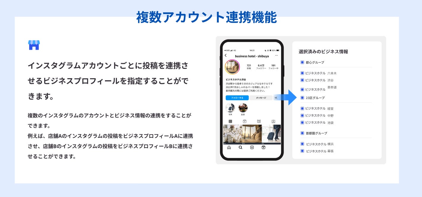 インスタグラムアカウントごとに投稿を連携させるビジネスプロフィールを指定することができます。