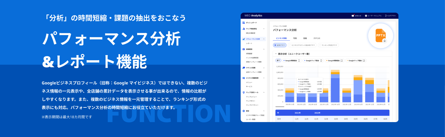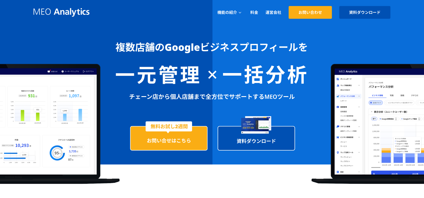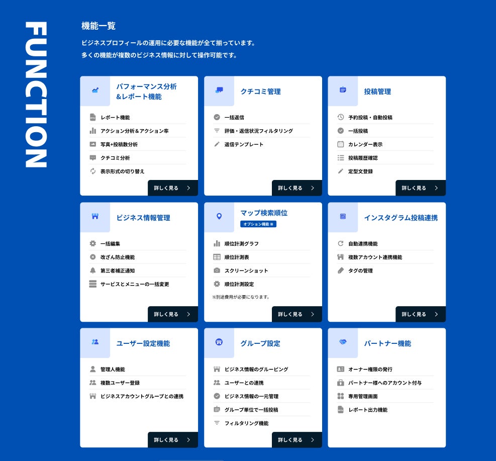 まるでひとつの店舗のように多店舗の運営をよりシンプルに、豊富な機能を揃えなによりも低価格で利⽤できるGoogleビジネスプロフィール運用支援ツールです。「インサイト情報分析」「⼝コミ管理・分析」「⼀括編集・⾃動補正」「⾃動投稿」「報告⽤レポート機能」など複数店舗管理する際に必要な機能全てを備えており、管理者の運用工数を大幅に削減します。