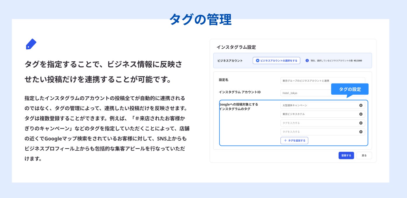 タグを指定することで、ビジネス情報に反映させたい投稿だけを連携することができます。