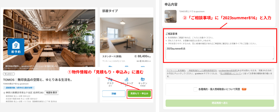 ・申込み方法 | 申込時のご相談事項に、キャンペーンコード【2023summer816】を入力 |
