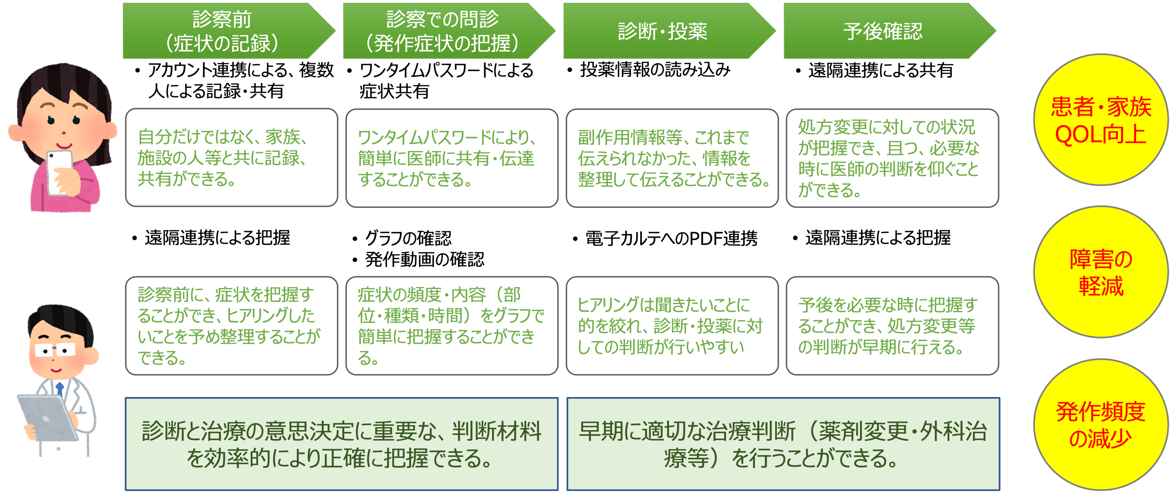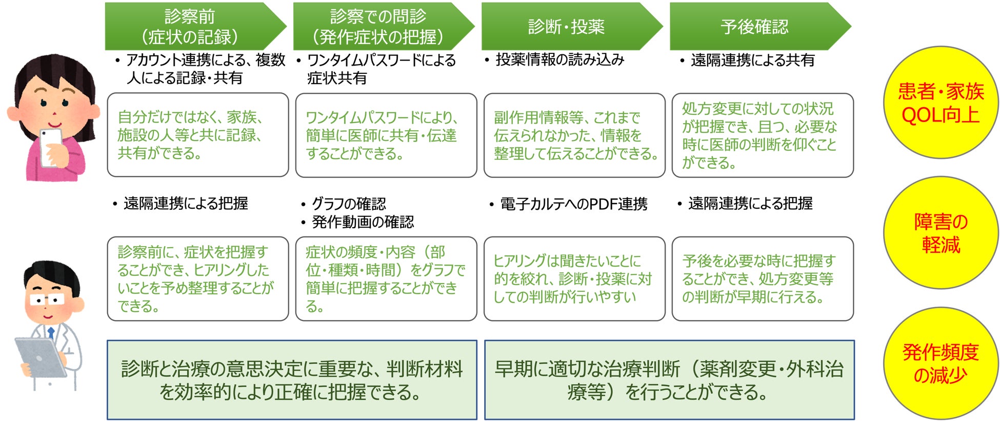 『nanacara for Doctor(ナナカラ・フォー・ドクター)』は、てんかんをお持ちのお子さんとそのご家族が、服薬状況発作、その他日々の記録を共有・管理できるアプリ「nanacara(ナナカラ)」(15,000ダウンロード ※2022年2月現在)で記録した発作状況などをインターネット経由で医師と共有する、医師向けのクラウド型サービスです。てんかん患者さんやご家族が「nanacara」から、医師へ日々の情報を共有することで、医師は「nanacara for Doctor」のweb画面で患者さんの病名等の基本情報のほか、「発作回数・服薬状況・発作時の動画」を診察時や定期的に閲覧することで、今まで難しかった正確な患者さんの状況把握が可能になり、より適切な判断と治療の質の向上につなげることができます。