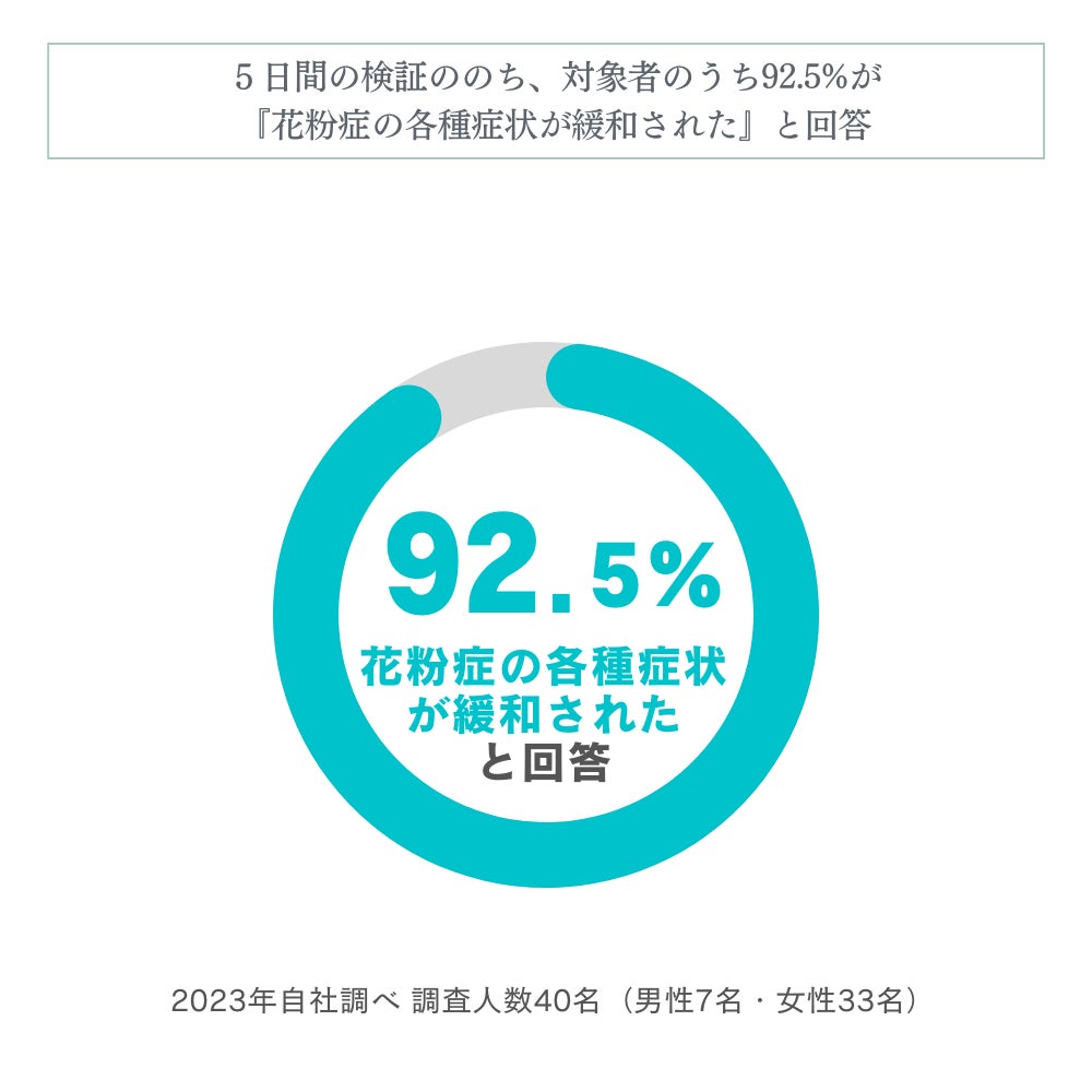 - 5日間の検証ののち、対象者のうち92.5%が『花粉症の各種症状が緩和された』と回答。