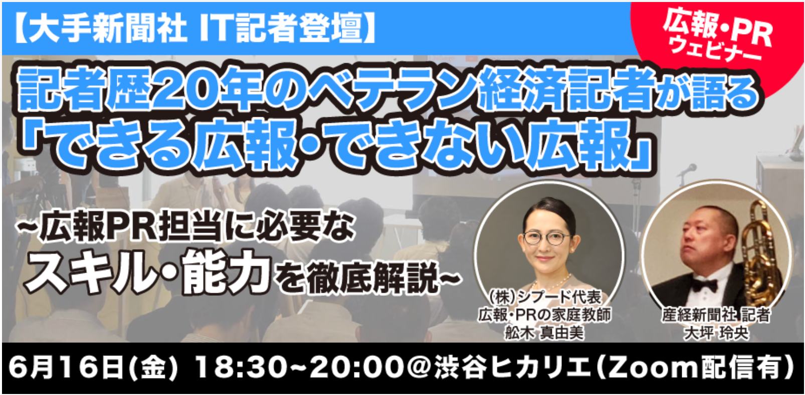 また記者と広報をつなぐイベントとして、6月16日(金)渋谷ヒカリエにて全国紙記者によるセミナーを開催することをお知らせします。(オンライン参加可)