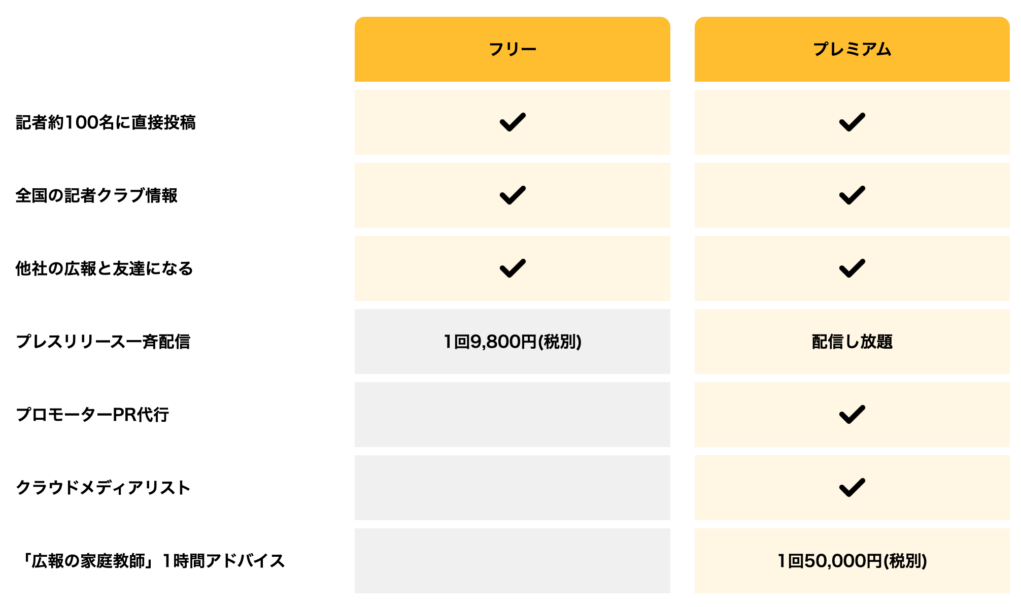 ・無料のフリー会員は、大手メディア所属のキーマンとなる記者100名に、プレスリリースをはじめとした自社のニュースを無料で何度でも情報提供が可能(フリー会員が、より多くのメディアへ配信したい場合、1回9,800円[税別]で約650メディアの中から300媒体ほどに一斉配信ができる。)