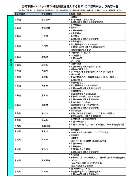 自転車ヘルメット購入補助金制度導入、全国272市区町村について