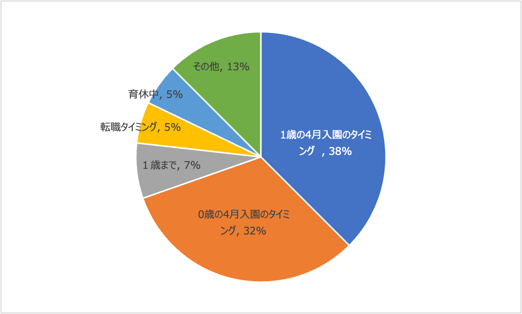 復職のタイミングはどのように決めたか聞いたところ「4月の保育園入園のタイミング」という方が7割以上に。このうち、1歳クラスで入園したのが38%、0歳クラスで入園したのが32%で、1歳以降での復職が多いことが分かります。待機児童が多かったころは、入園しやすい0歳児のうちにという方が多くいましたが、今は1歳やそれ以降の年齢で4月入園を決めるというママが多くを占めるようになりました。