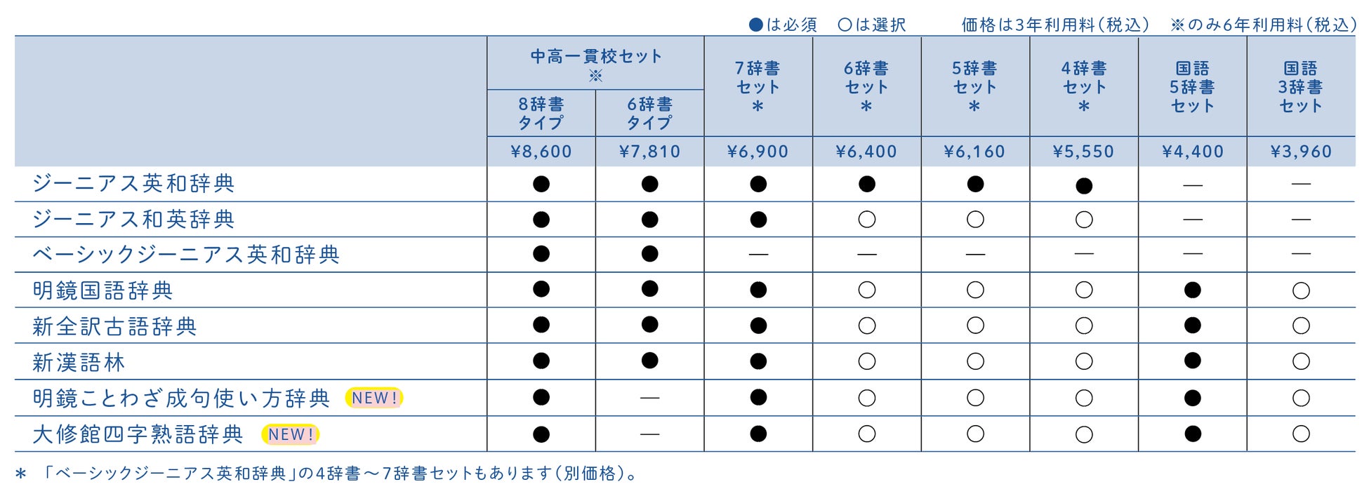 ※上表記載の7辞書・6辞書・5辞書・4辞書セットは英和辞典に必ず『ジーニアス英和辞典』を含みます。英和辞典が『ベーシックジーニアス英和辞典』のセットは別価格となります。