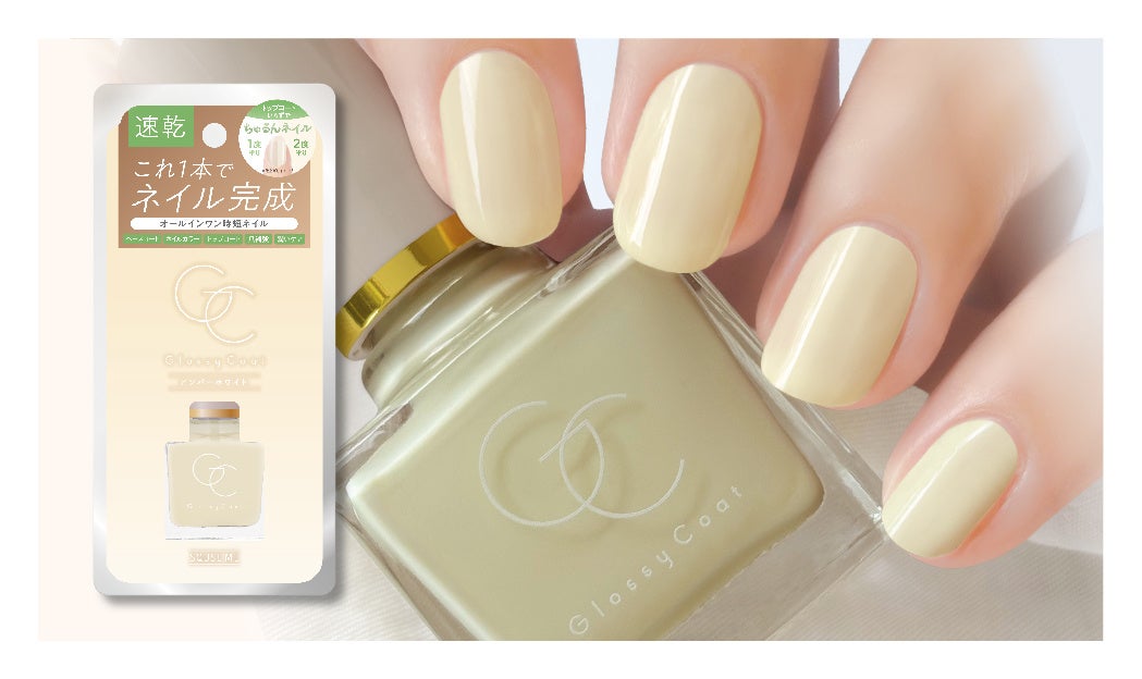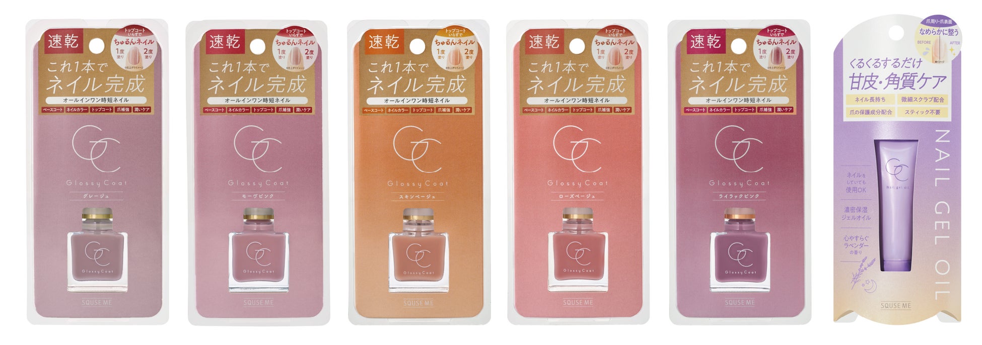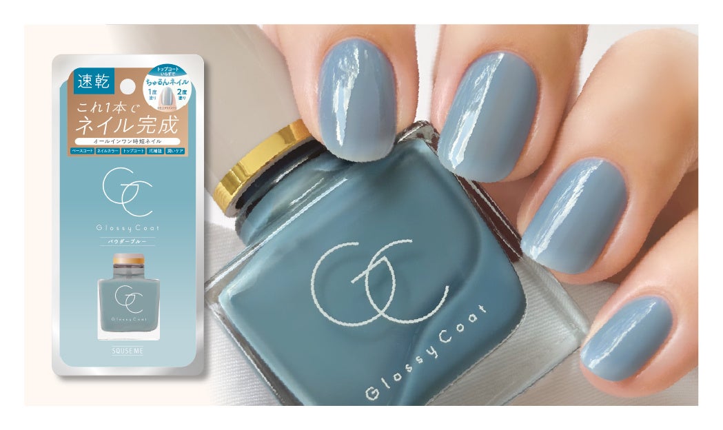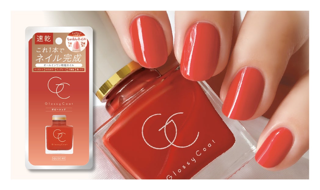 スキューズミー「グロッシーコート」は、 ベースコート、ネイルカラー、トップコート、爪補強、さらに潤いケア(保湿)まで叶える、 1本で5つの機能をあわせ持ったオールインワンネイルです。2017年の発売以来、速乾タイプで塗りやすく、時間がなくてもサロン級のキレイな指先を手に入れることができると評判を呼び、数々のコスメアワードを受賞するなど、大変ご好評をいただいているセルフネイル派に人気のネイルシリーズです。
