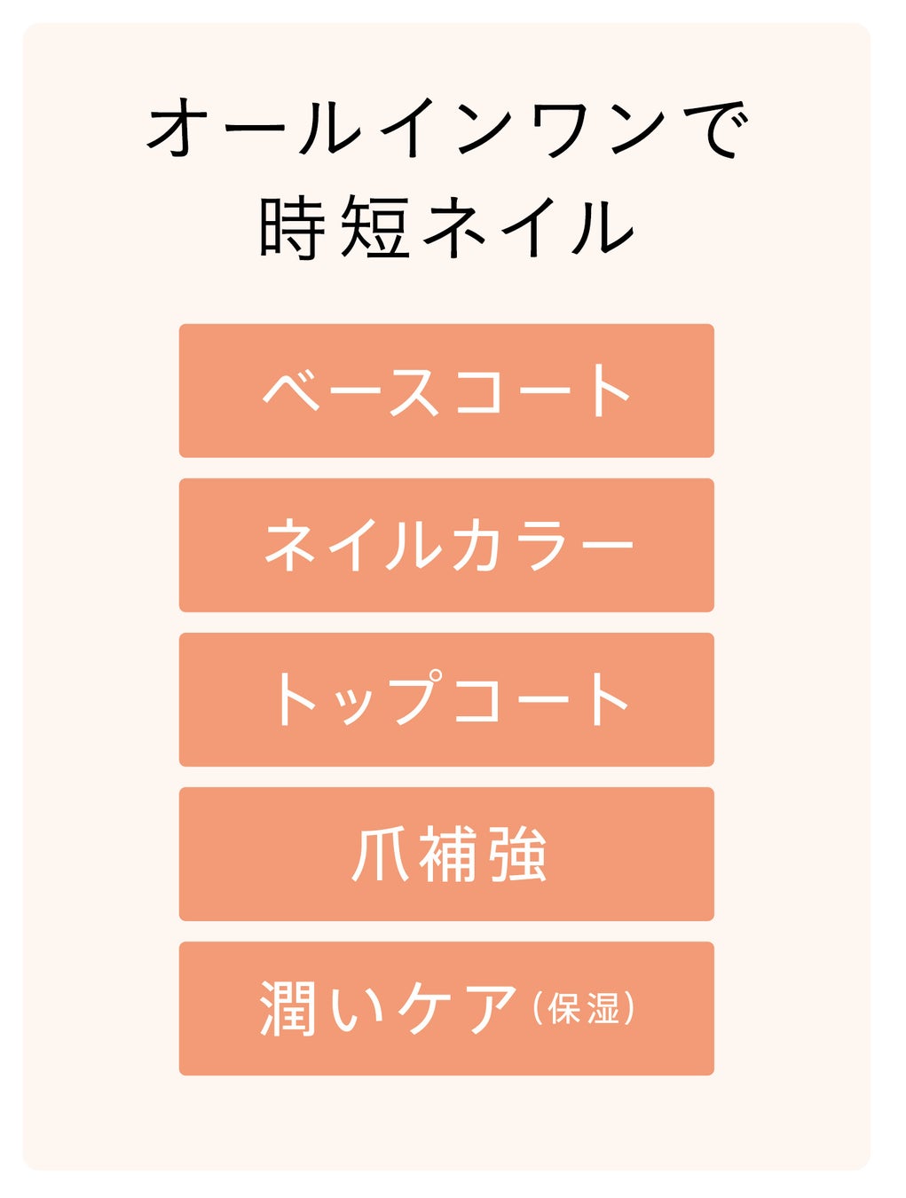1本で、ベースコート・ネイルカラー・トップコート・爪補強・潤いケア(保湿)の5つの機能。セルフネイルにかかる時間を大幅カットします。