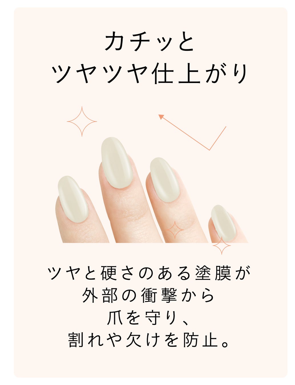 ツヤと硬さのある塗膜が外部の刺激から爪を守り、割れや欠けを防止します。