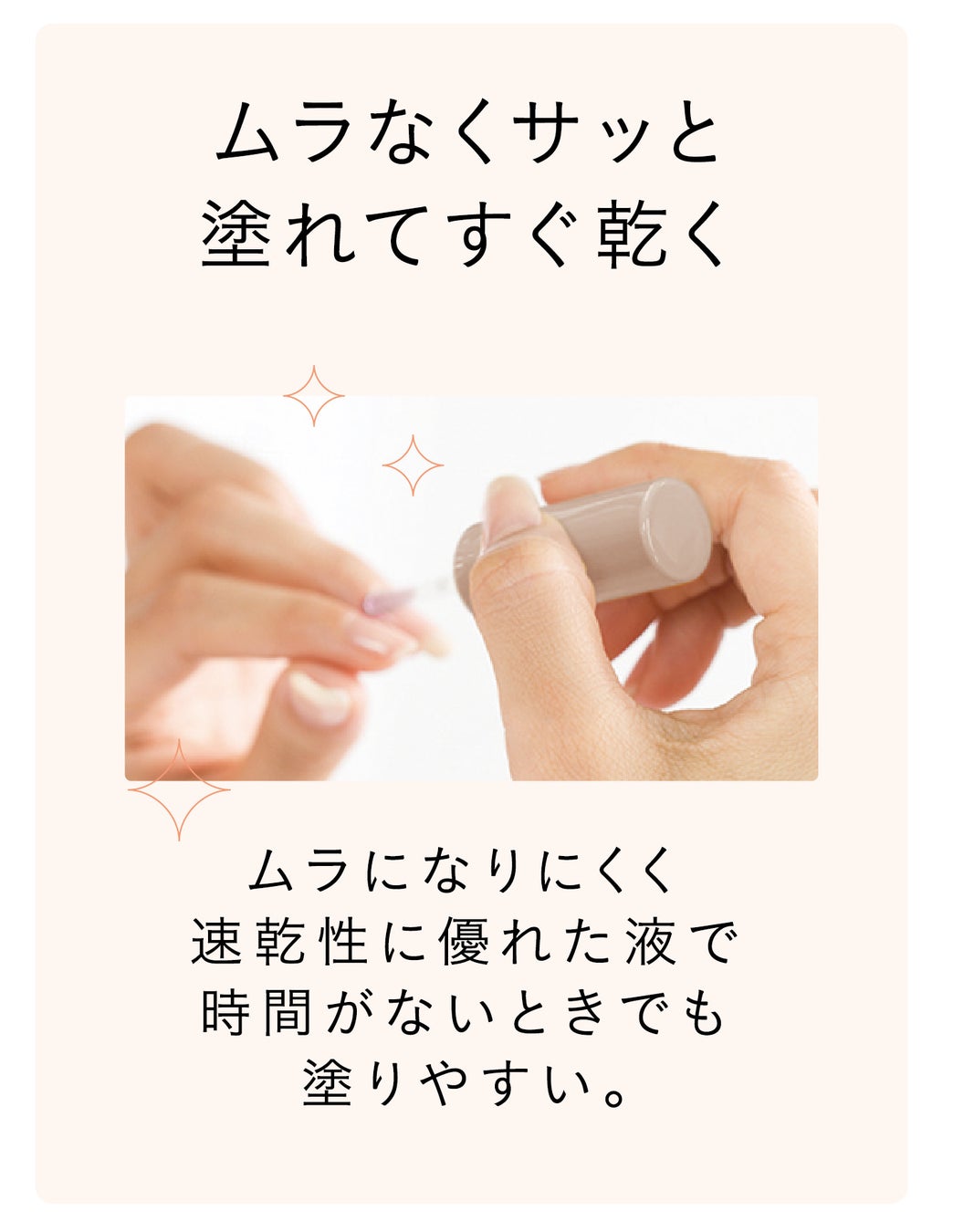 ムラになりにくく速乾性に優れているため、時間がない時でも塗りやすくストレスフリーにお使いいただけます。