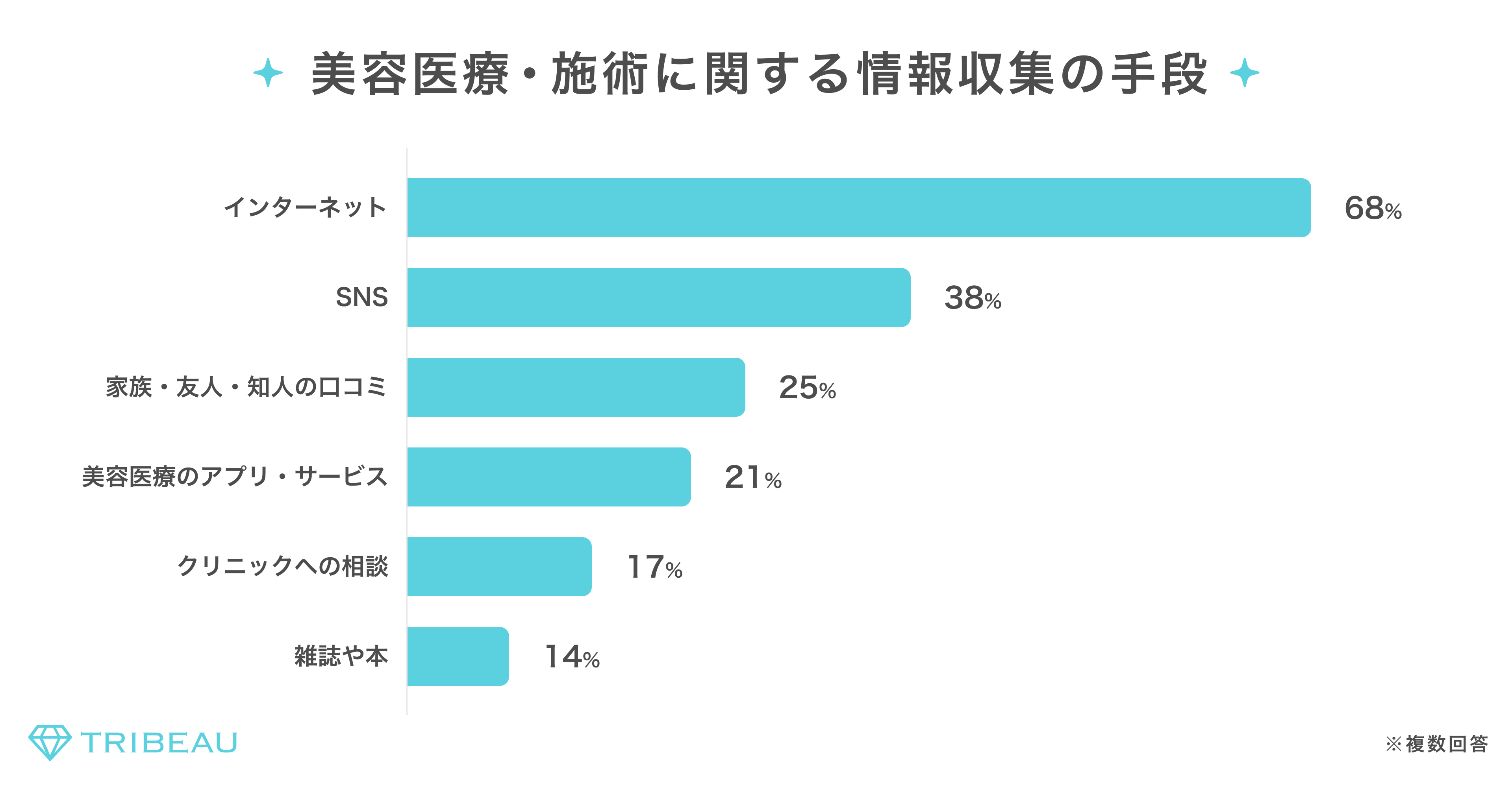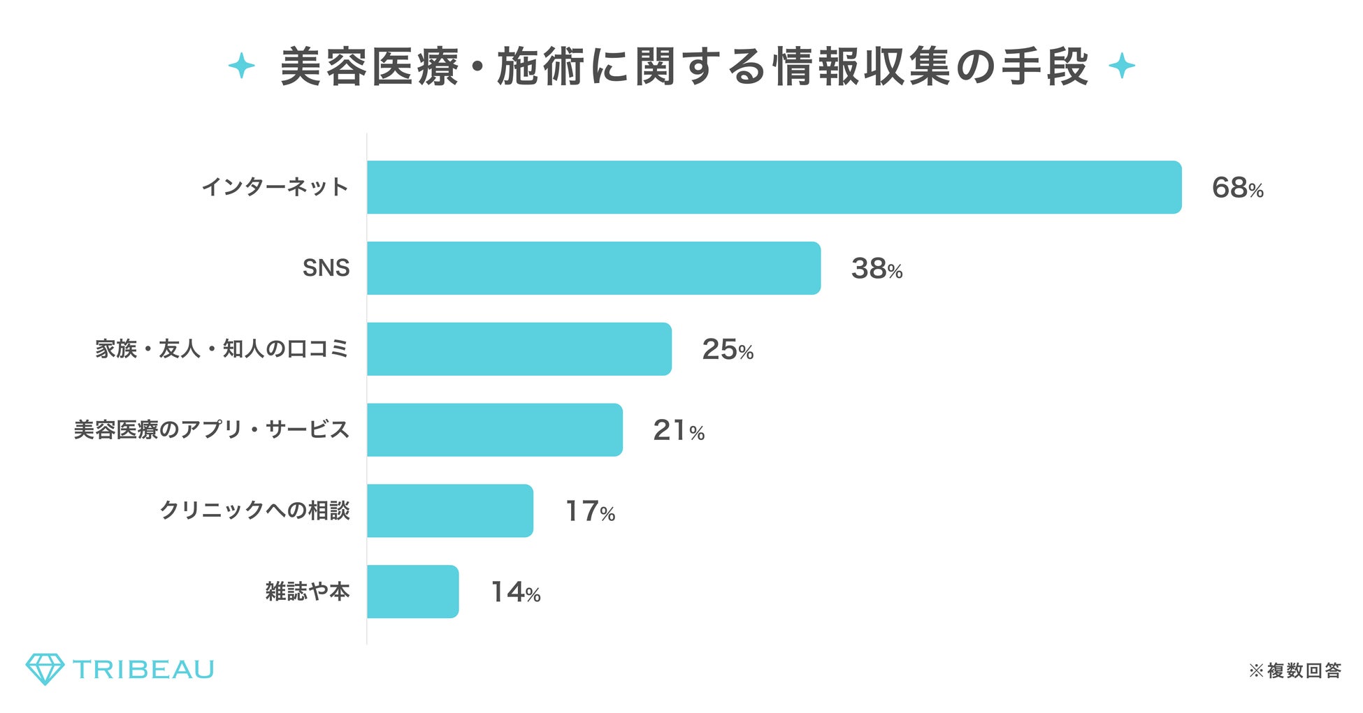 美容医療・施術に関する情報収集経路について聞いたところ、「インターネット」(68%)、が半数以上を占める一方で、スマホの広がりにより「SNS」(38%)「口コミ」(25%)「美容医療のアプリ・サービス」(21%)など、人を介した経路が台頭していることがうかがえる。