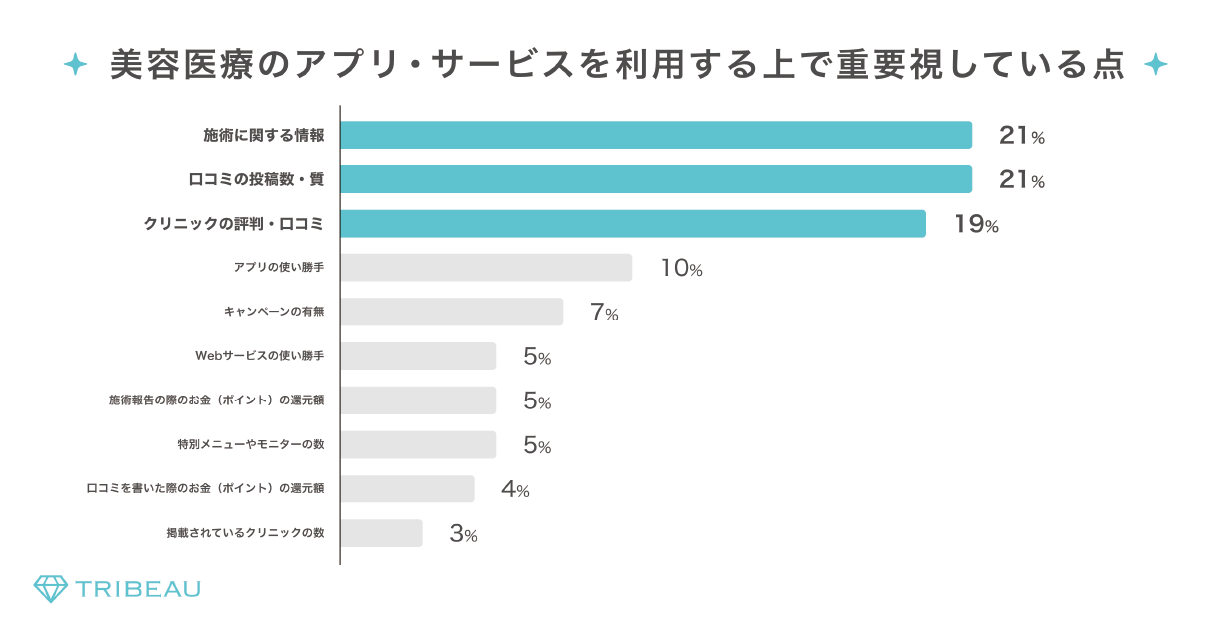 美容医療のアプリ・サービスを利用する上で重要視している点について聞いたところ、「施術に関する情報」(21%)「口コミの投稿数・口コミの質」(21%)「クリニックの評判・口コミ」(19%)となった。美容医療・施術を検討する際に重要視している情報を得る手段として、美容医療のアプリ・サービスが新たな情報取集経路として注目されていることが読み取れる結果となった。