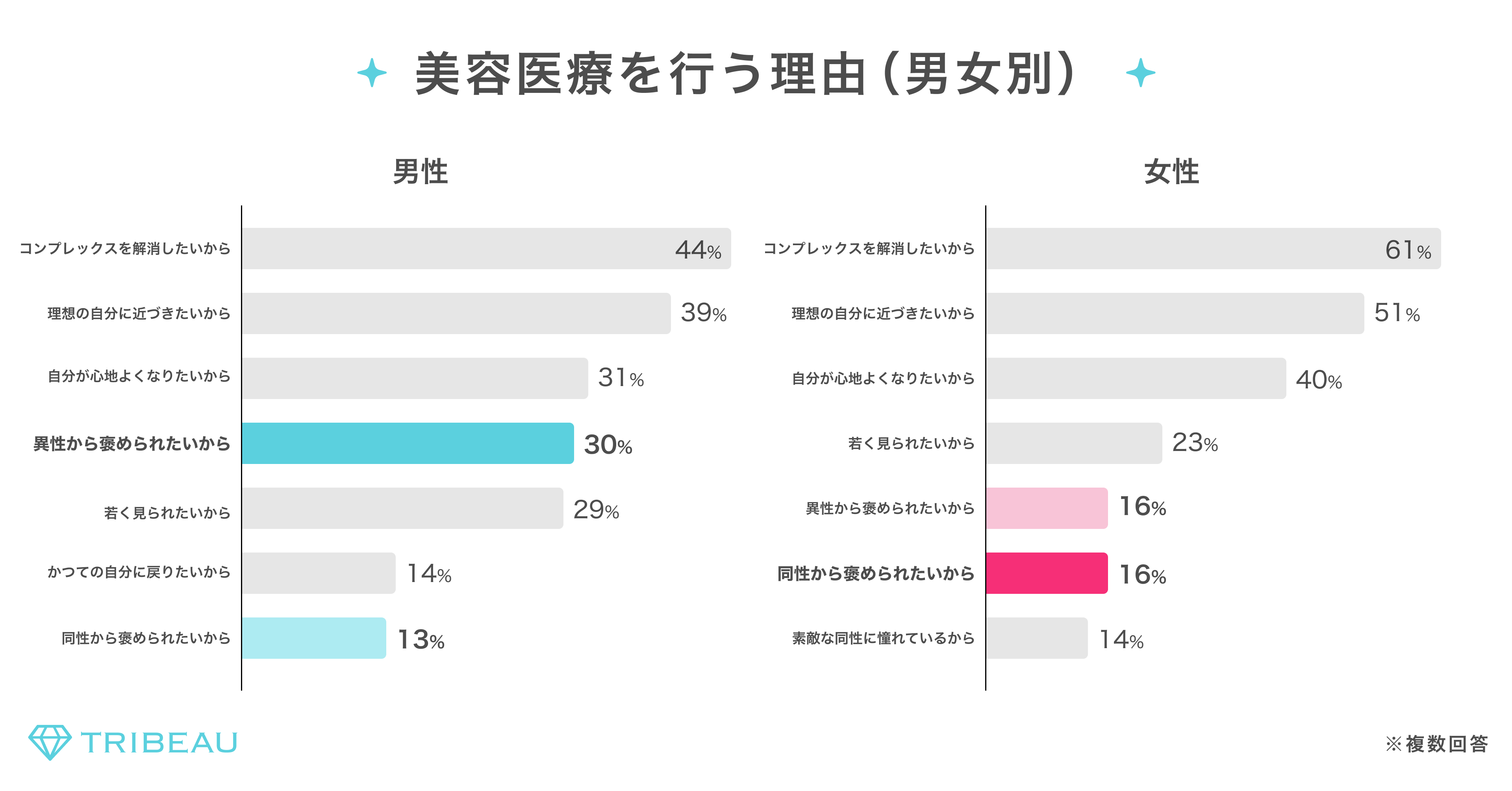 また、世代別に比較をすると、女性が「異性から褒められたいから」(16%)「同性から褒められたいから」(16%)と同率に対して、男性は「異性から褒められたいから」(30%)「同性から褒められたいから」(13%)と、男性の方が異性を意識して美容医療を検討・行うことが高いことが見て取れる。