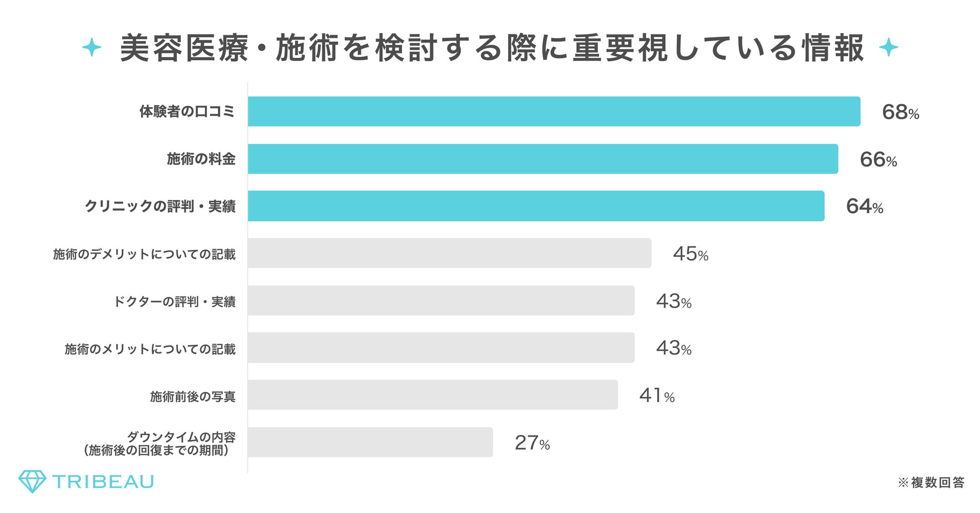 美容医療・施術を検討する際に重要視している情報について聞いたところ、「体験者の口コミ」(68%)「施術の料金」(66%)「クリニックの評判・実績」(64%)が半数以上を超える結果となり、施術やクリニックに関して情報を集める際に体験者によるリアルな声を重要視していることが分かった。