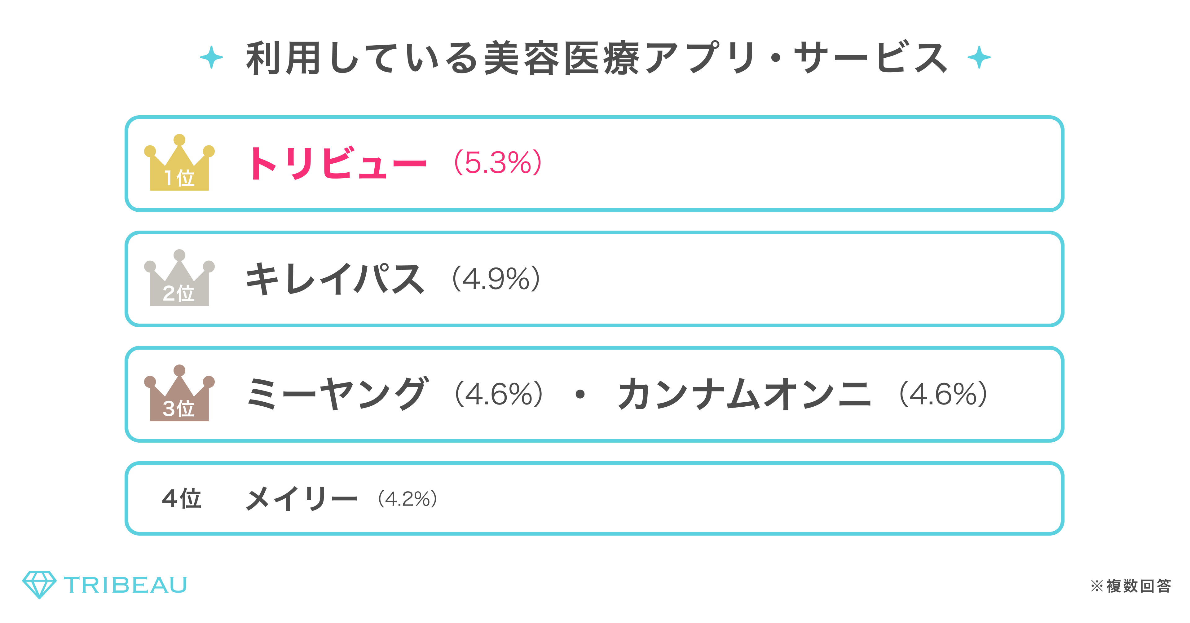 利用している美容医療のアプリ・サービスについて聞いたところ、「トリビュー」(5.3%)が一番利用されており、次いで「キレイパス」(4.9%)「ミーヤング」(4.6%)「カンナムオンニ」(4.6%)「メイリー」(4.2%)が続いた。美容医療検討者が重要視している「体験者の口コミ」や「クリニックの評判・実績」についての情報が豊富な点や、施術をお得に受けられる「モニター価格」を数多く提供している点が「トリビュー」が支持されている要因と考えられる。