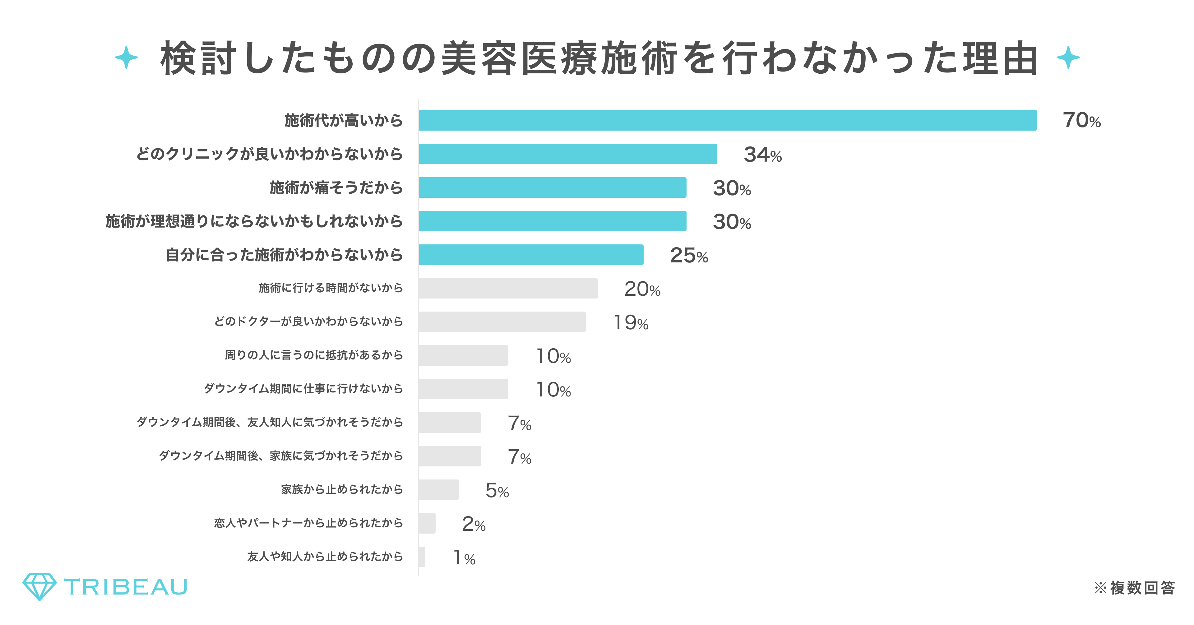 ・美容医療を検討したものの施術を行わなかった理由を聞いたところ、「施術代が高いから」(70%)が半数以上を占める一方で、「どのクリニックが良いか分からないから」(34%)「施術が痛そうだから」(30%)「施術が理想通りにならないかもしれないから」(30%)「自分に合った施術が分からないから」(25%)と美容医療を受ける際に失敗をするかもしれない事への不安や情報収集の難しさがあることがうかがえた。
